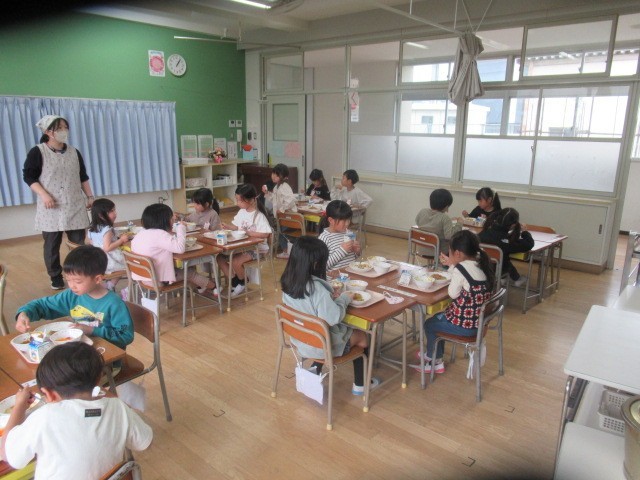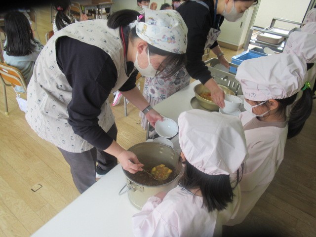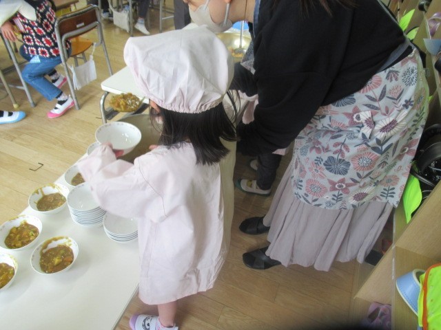 この後、支援の先生たちの手も借りながら、給食を配膳し、おいしいカレーライスをほおばっていました。