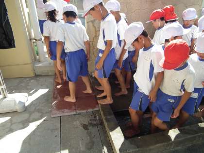 朝のジョギングや運動場での活動後、子供たちは足洗い場で足を洗います。