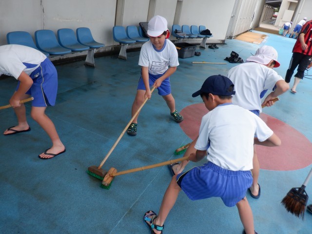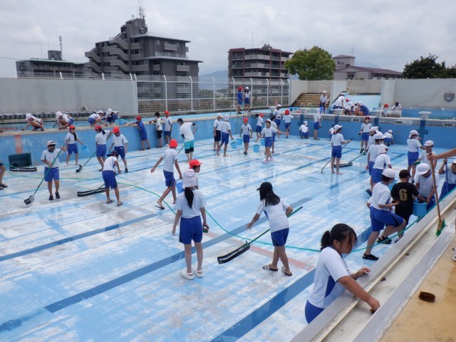 6月から始まるプールを使った学習のために、5・6年生が掃除をしてくれました。1年間使用しなかったプールの底には飛んできたゴミや泥が溜まっていて、とても汚い状態でした。短い時間でしたが、汚れることを気にせず、一生懸命にプールやプールサイドを磨いてきれいにしてくれました。きれいになったプールでの学習が楽しみですね。5・6年生の皆さん、ありがとうございました。