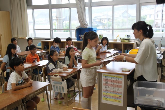 各教室では、担任から一人一人にあゆみが手渡されました。頑張ったこと、頑張ってほしいことなどを担任から声をかけました。子供たちは、どんな評価かドキドキしながらあゆみを見ていました。