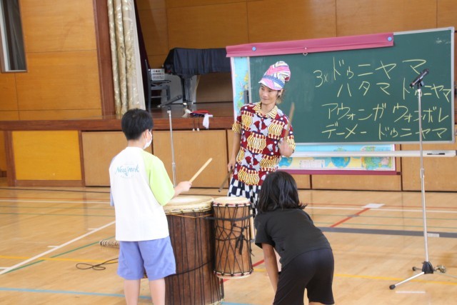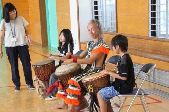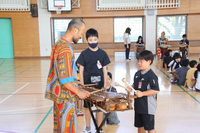 大野城市では、まどかぴあ主催で子供たちや地域住民向けの芸術体験プログラムを実施しています。この日は4年生が音楽科の時間として、アフリカの民族音楽に触れました。演奏を聴くだけでなく、楽器の演奏も体験することができ、異文化理解が深まり、子供たちにとって貴重な体験になりました。