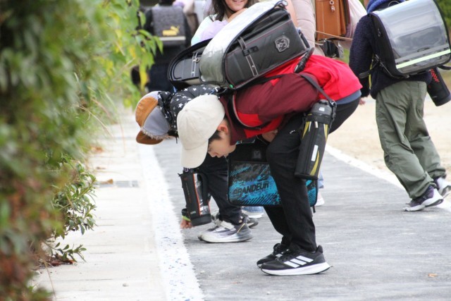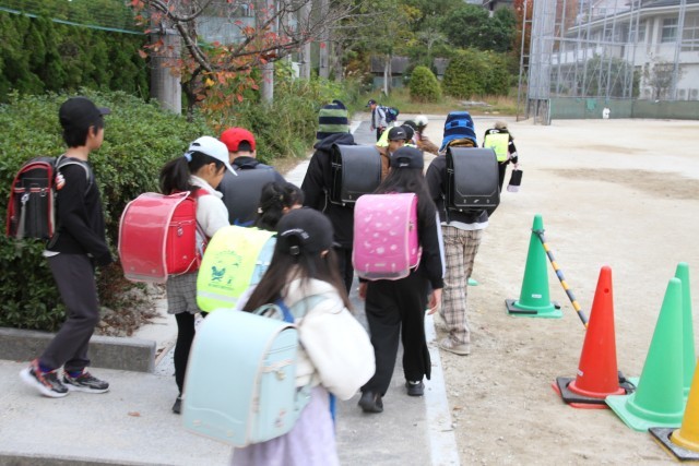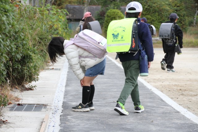 南門舗装路のコンクリートが固まり、子供たちが通れるようになりました。子供たちは、自分が埋めたビー玉を探しながら通っていました。この日は晴れていましたが、多くの子供たちが新しい道を通っていました。舗装路の名前は各クラスで話し合い、代表委員会で決定します。