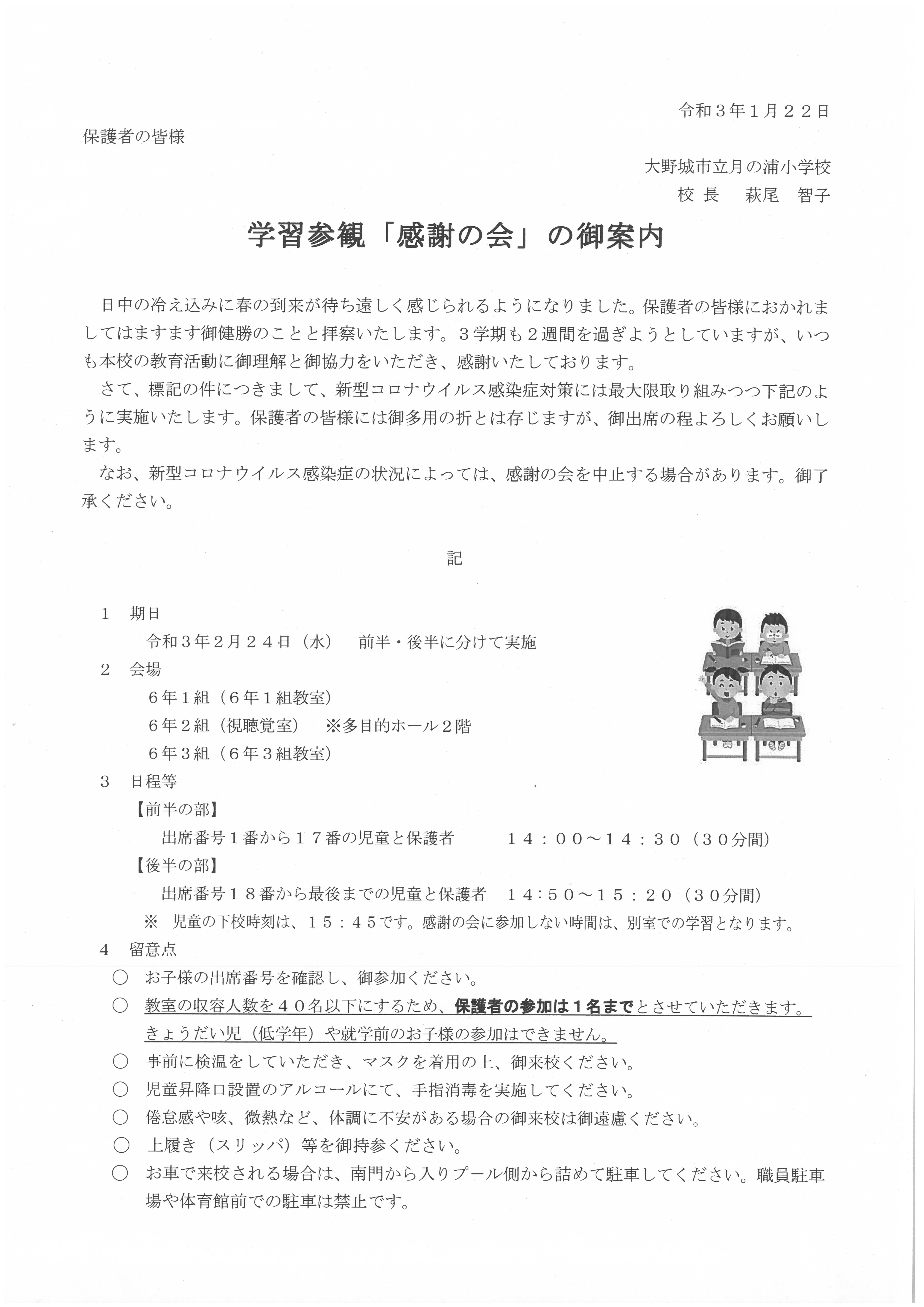 学習参観『感謝の会』の御案内です。新型コロナウイルス感染症には最大限取り組みつつ下記のように実施いたします。