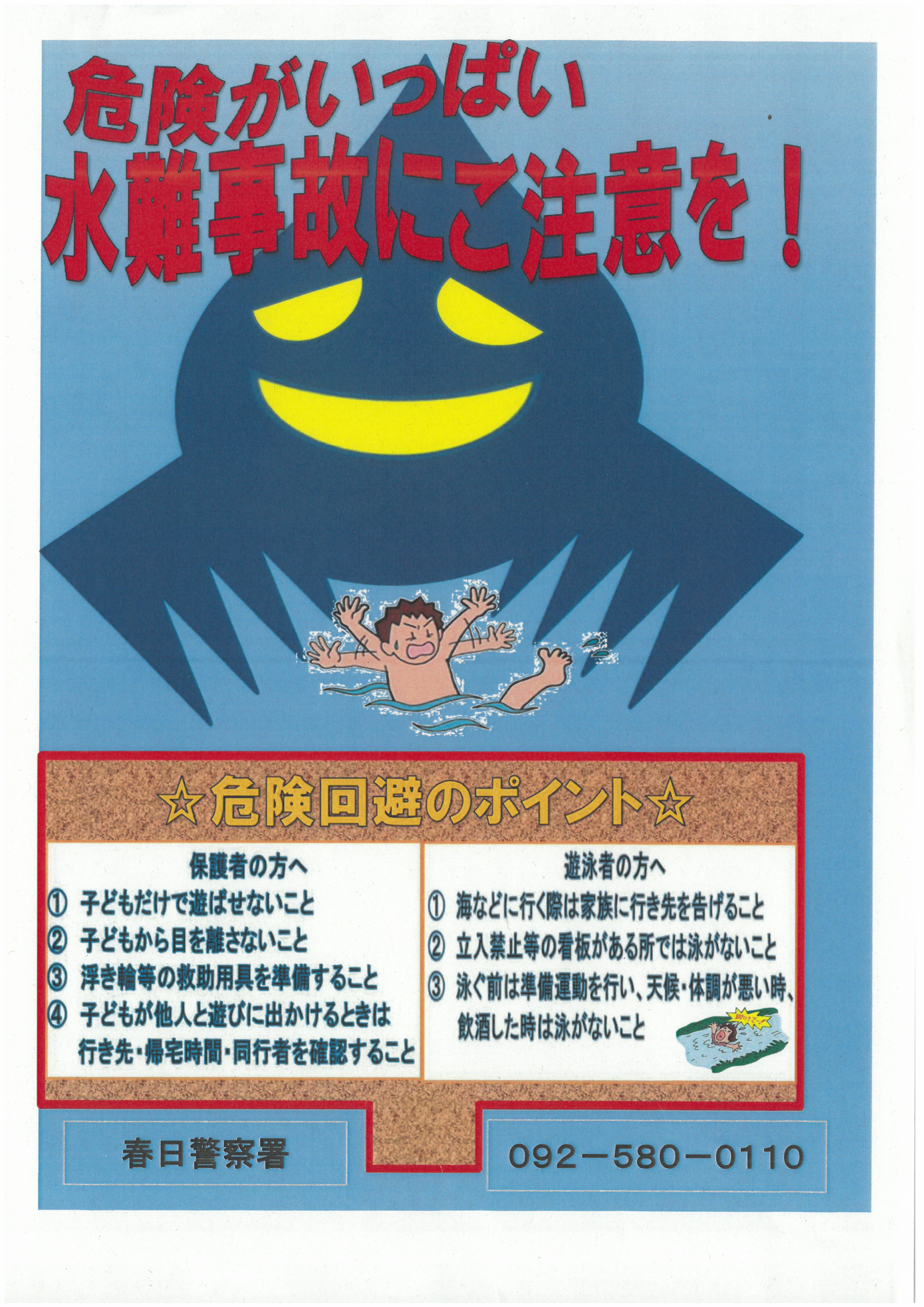春日警察署から危険回避のポイントのお知らせがきています。夏休みに気を付けたい水の事故から命を守る大切なお知らせですので、是非ご一読ください。