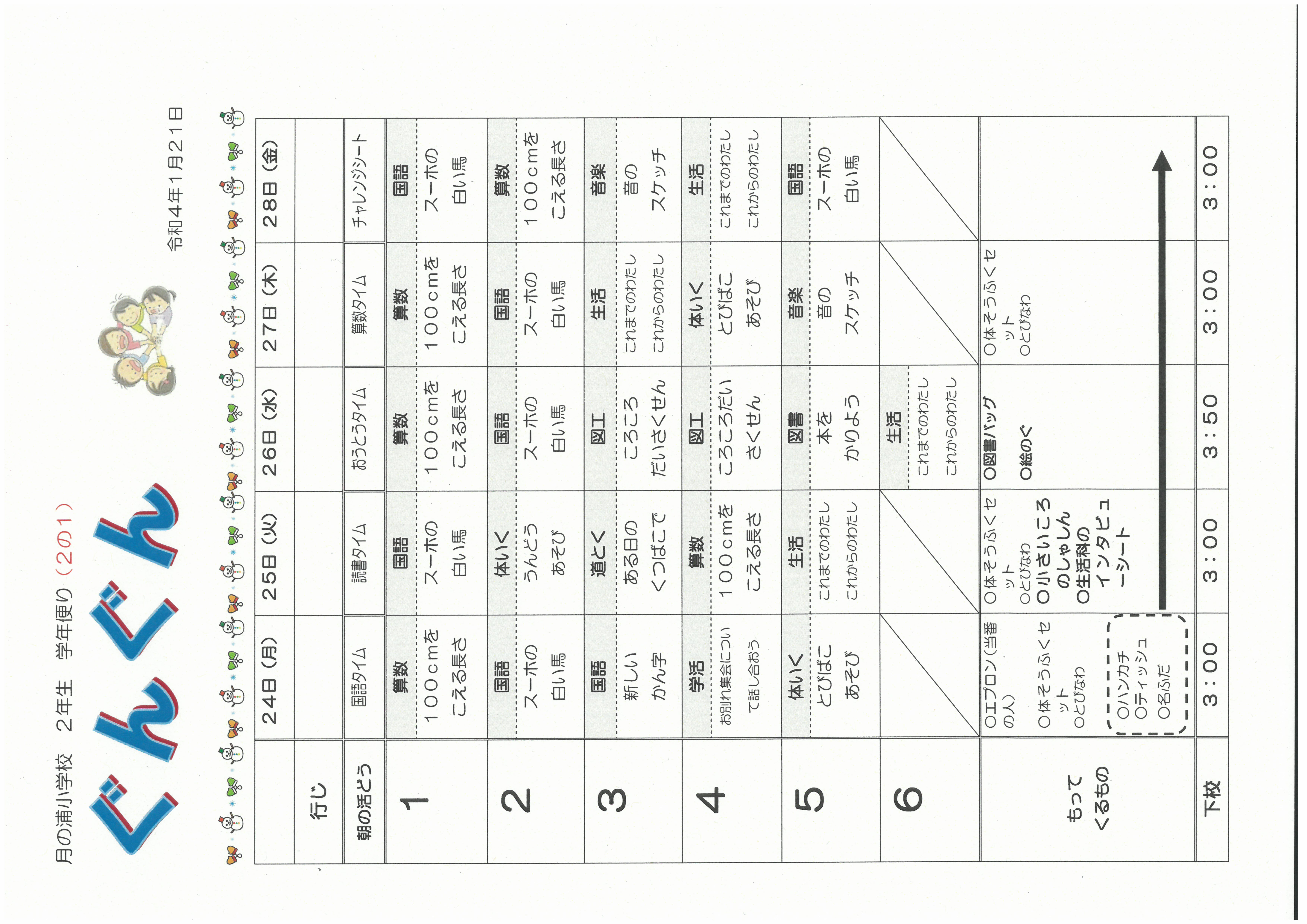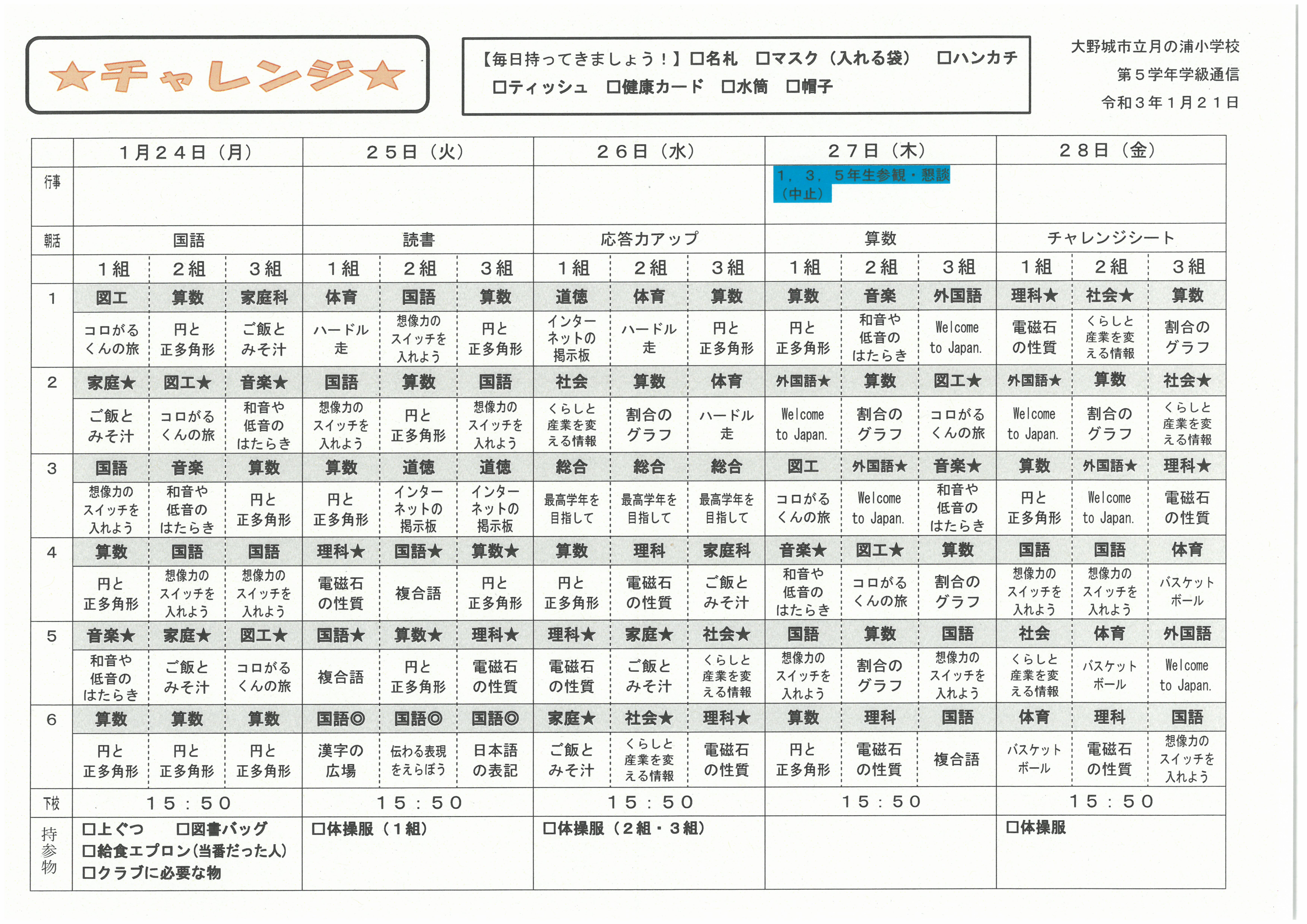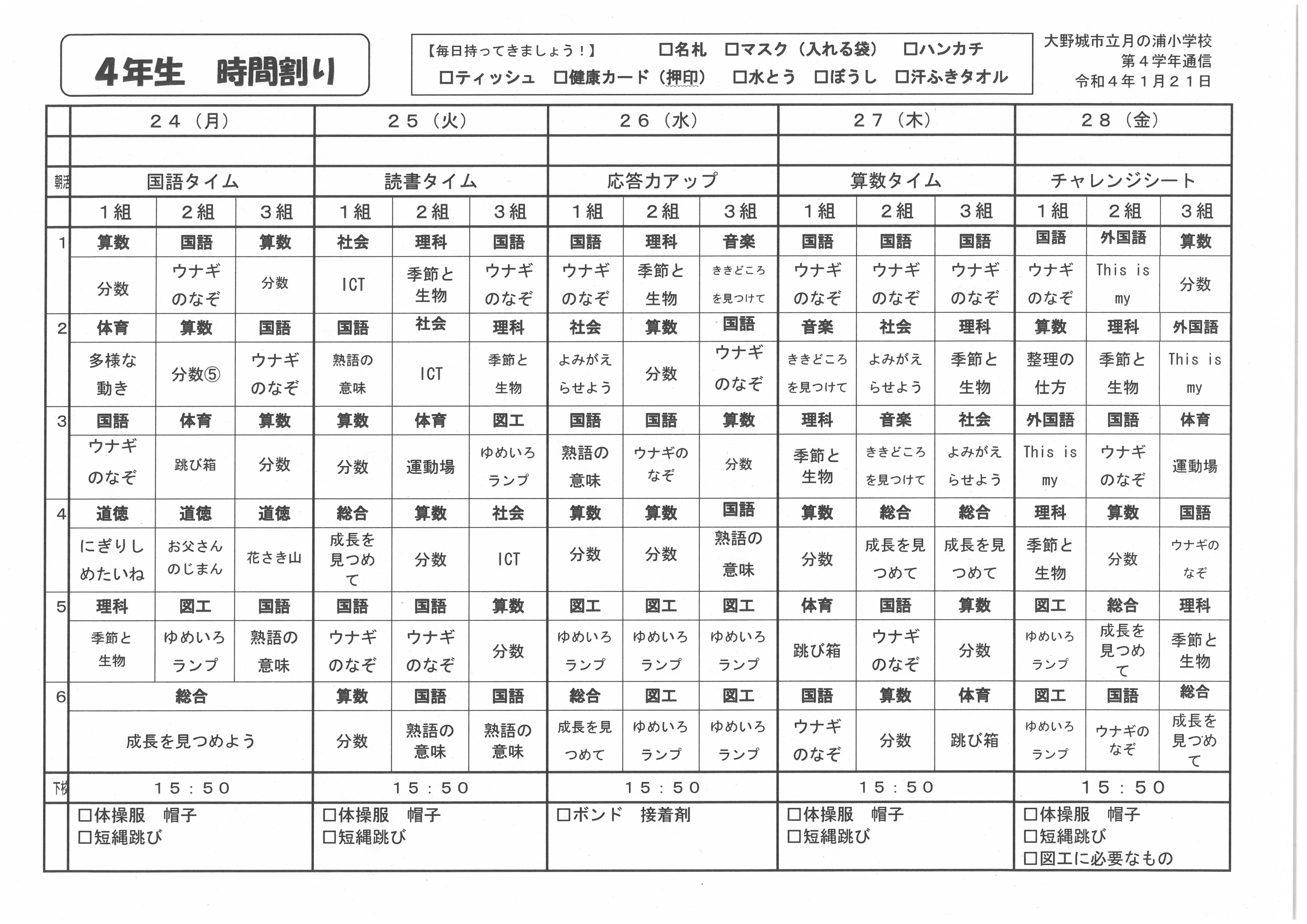 1月24日(月)からの時間割 公開日 2022/01/21 更新日 2022/01/21 お知らせ 来週1/24(月)からの時間割をお知らせ致します。 時間割 1年生 時間割 2の1 時間割 2の2 時間割 3年生 時間割 4年生 時間割 5年生 時間割 6年生