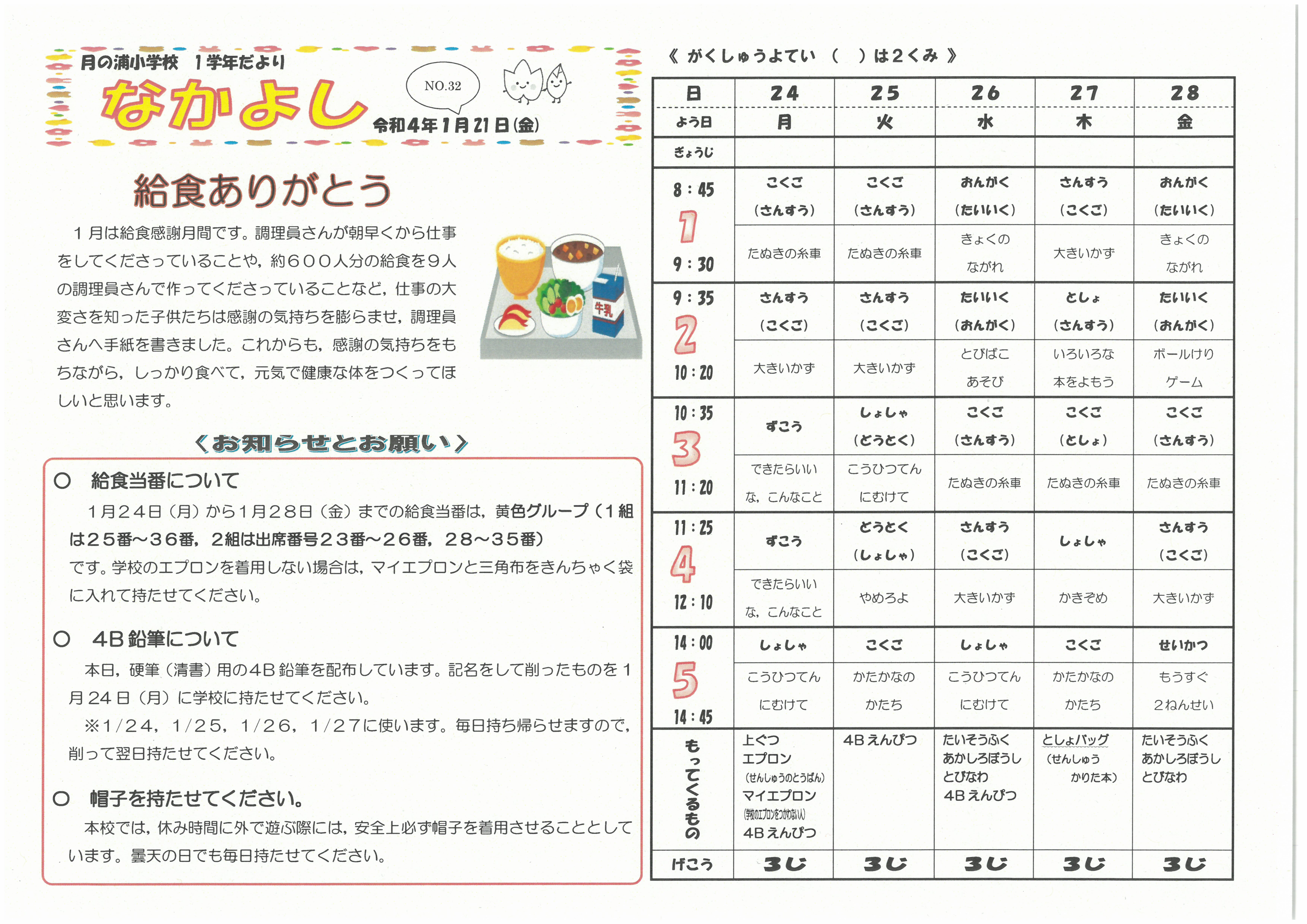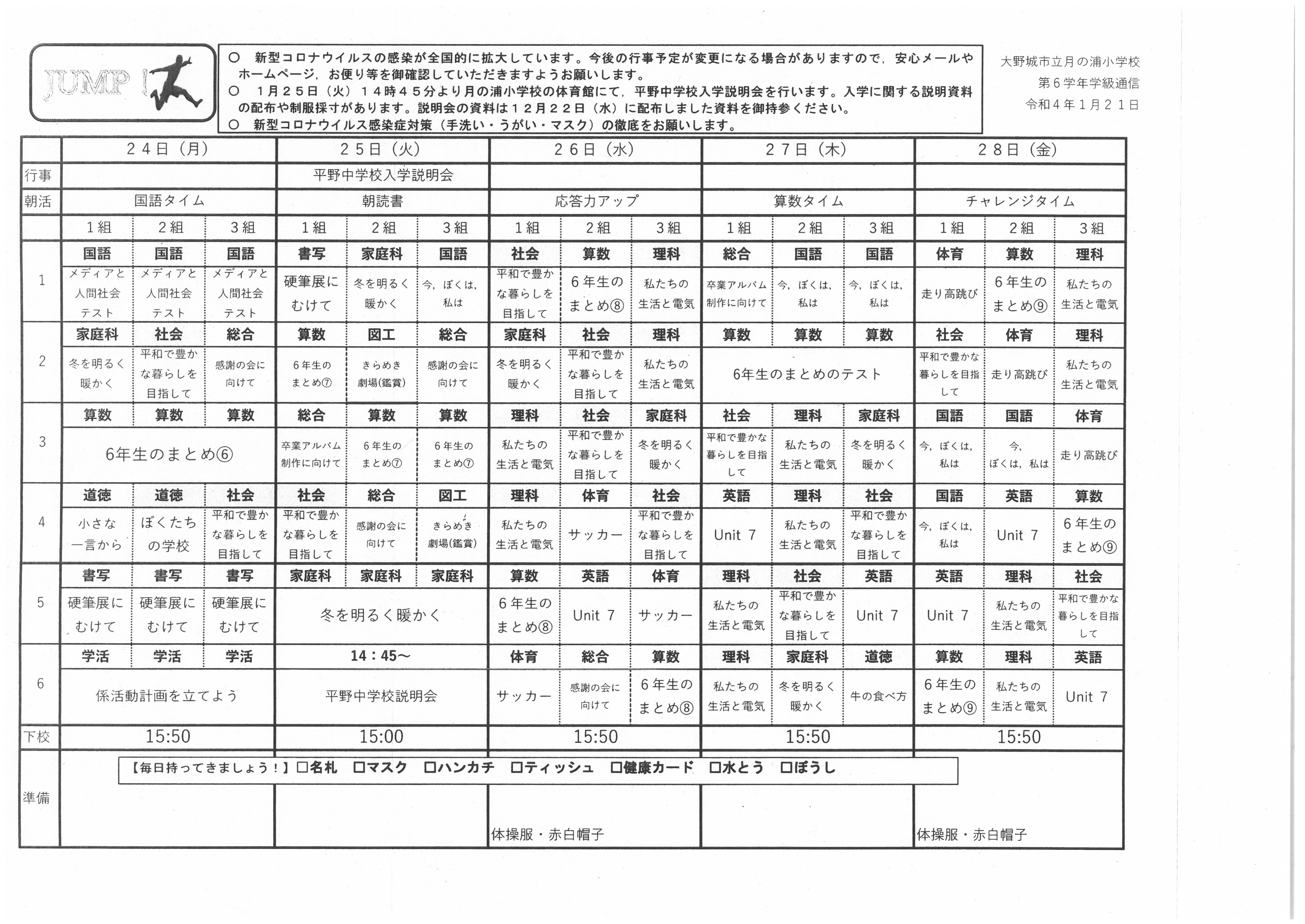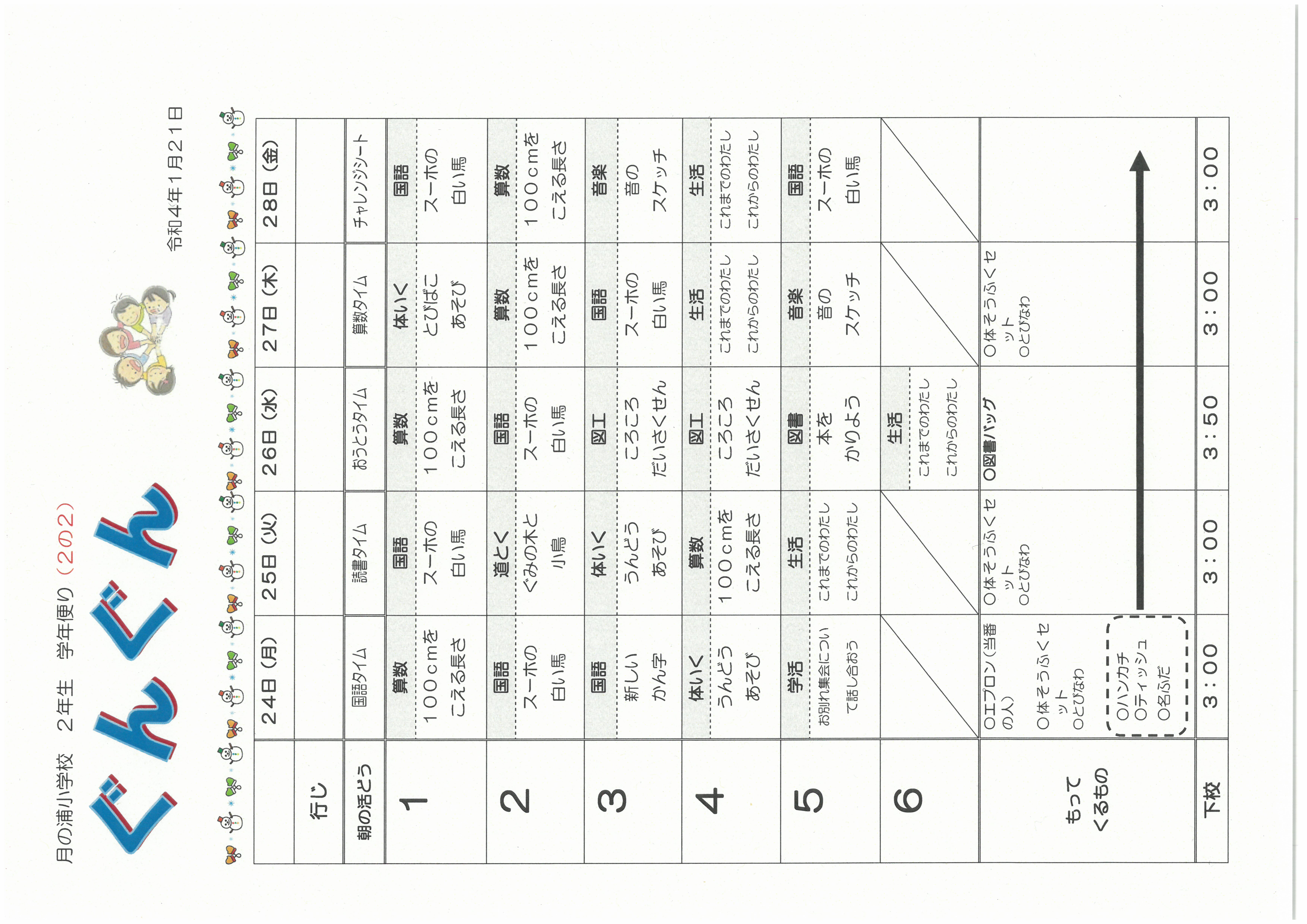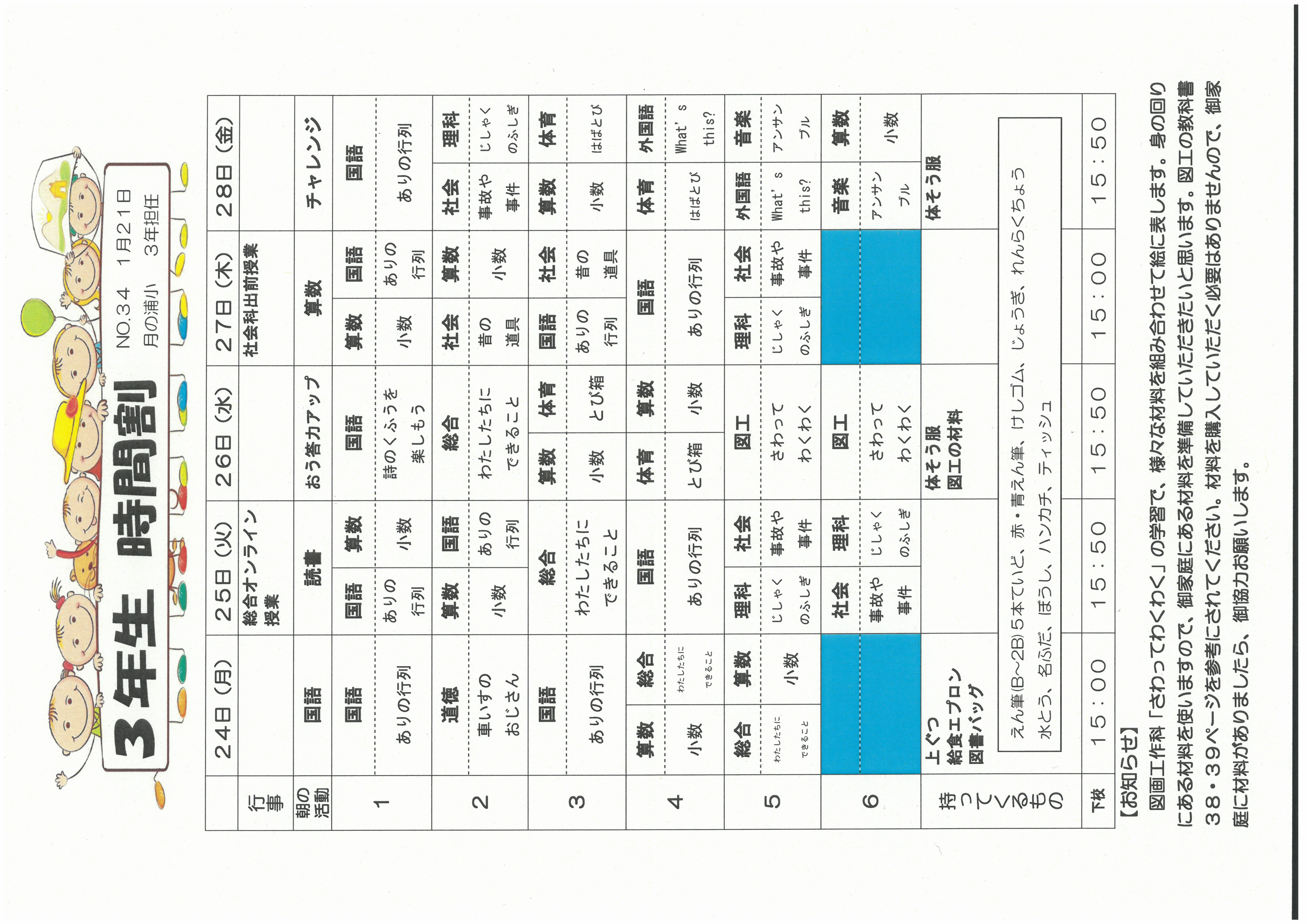 1月24日(月)からの時間割 公開日 2022/01/21 更新日 2022/01/21 お知らせ 来週1/24(月)からの時間割をお知らせ致します。 時間割 1年生 時間割 2の1 時間割 2の2 時間割 3年生 時間割 4年生 時間割 5年生 時間割 6年生