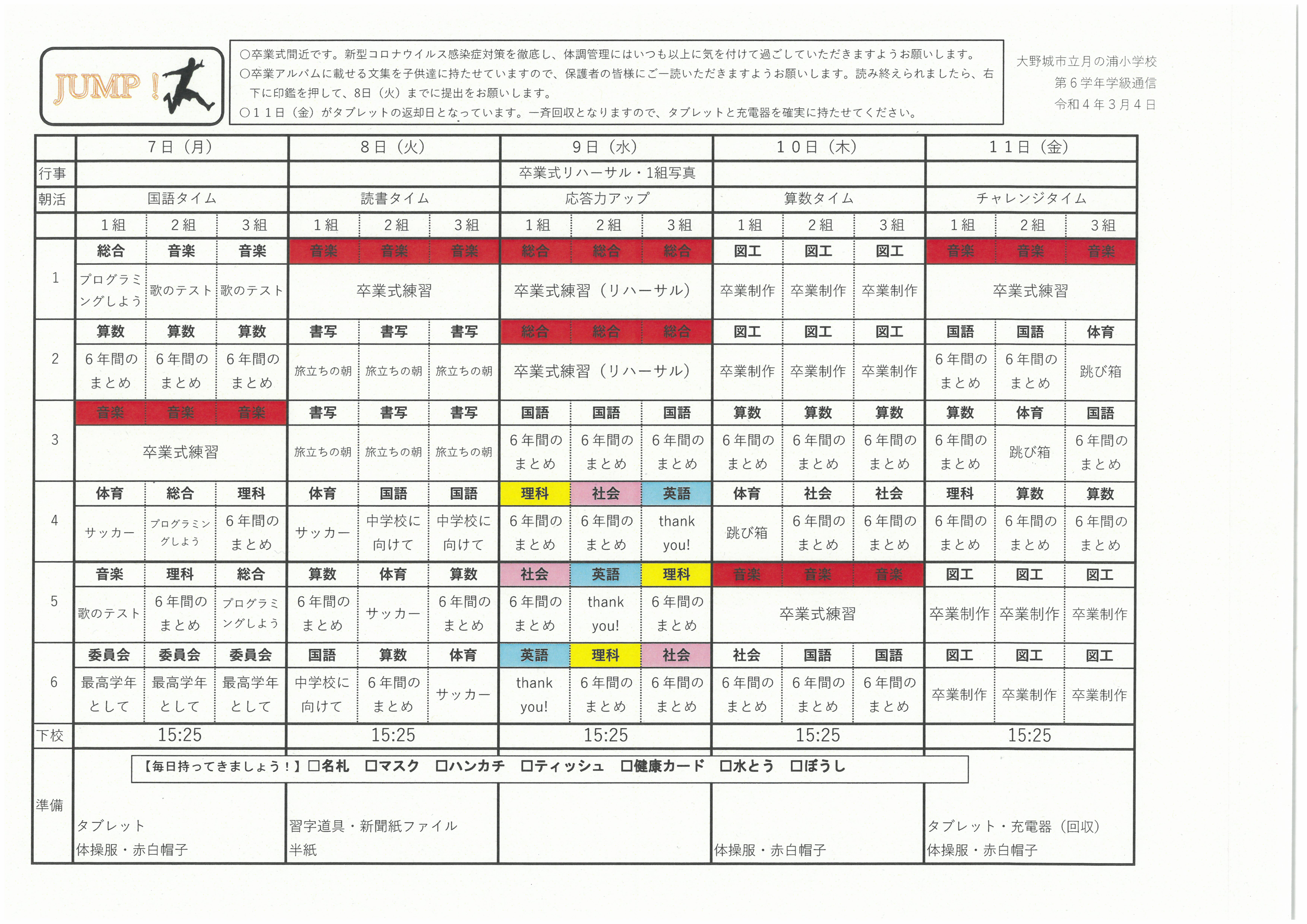 来週3月7日(月)からの時間割をお知らせ致します。