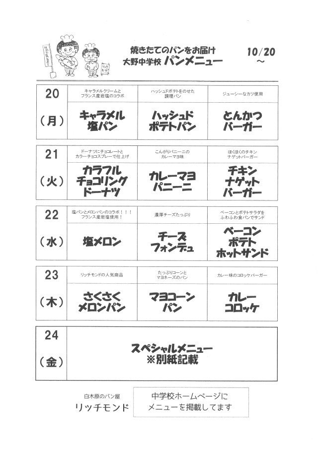 令和7年10月20日(月)~10月24日(金) パンメニュー