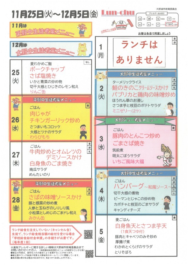 令和7年11月25日(火)~12月5日(金) ランチメニュー