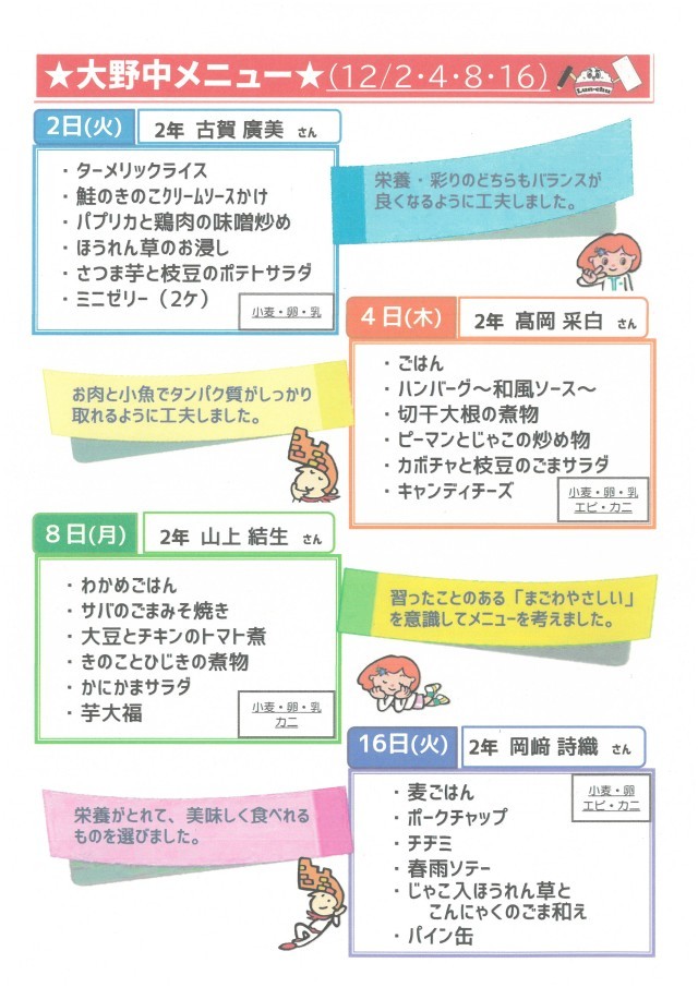 令和7年12月2,4,8,16日は大野中生徒考案メニュー