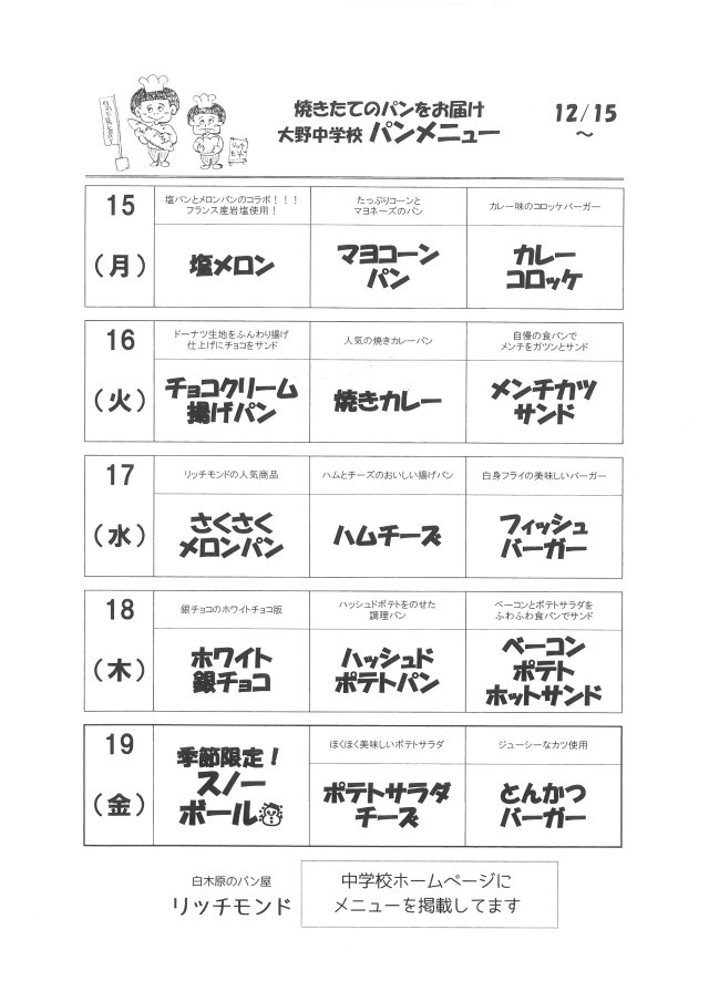 令和7年12月15日(月)~12月19日(金) パンメニュー