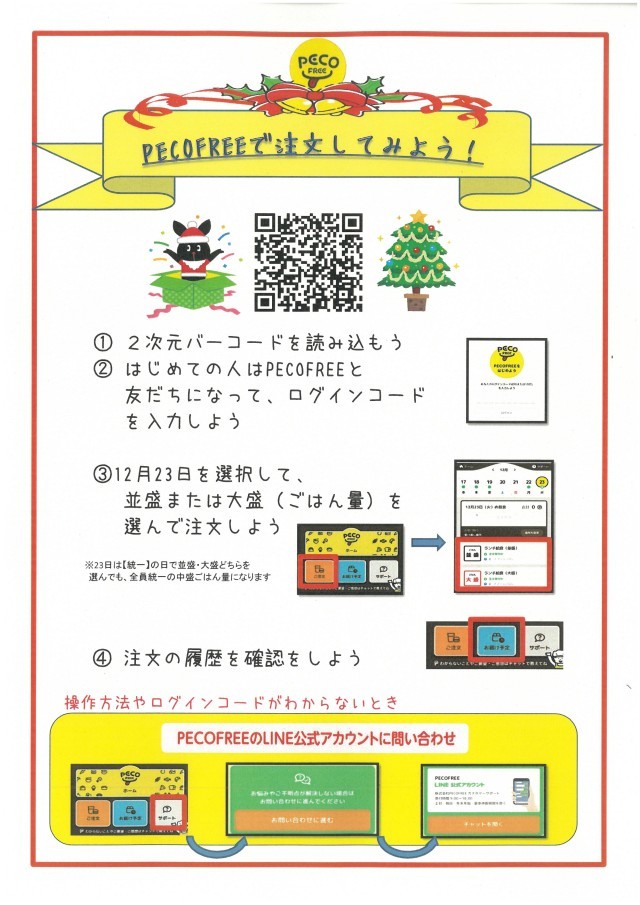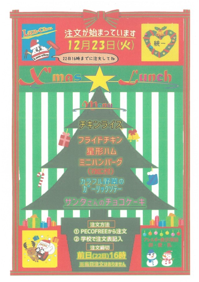 令和7年12月23日(火)は「クリスマスランチ」となっています。