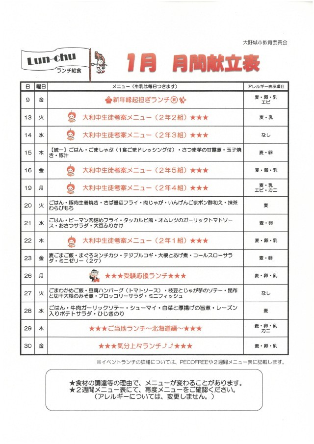 令和8年1月 ランチ給食「1月」月間献立表