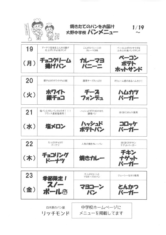 令和8年1月19日(月)~1月23日(金)パンメニューです。