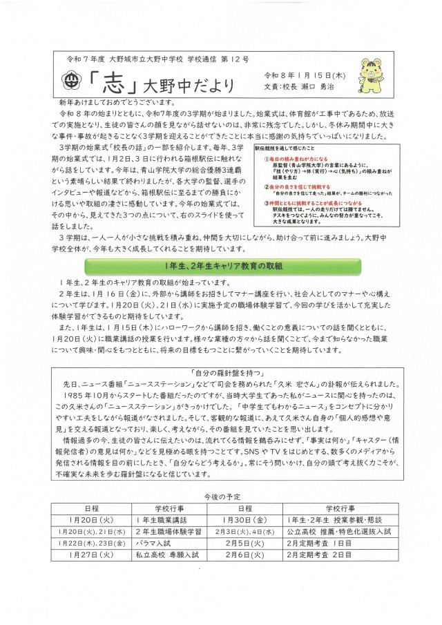 令和8年1月15日(木) 大野中だより「志」:第12号
