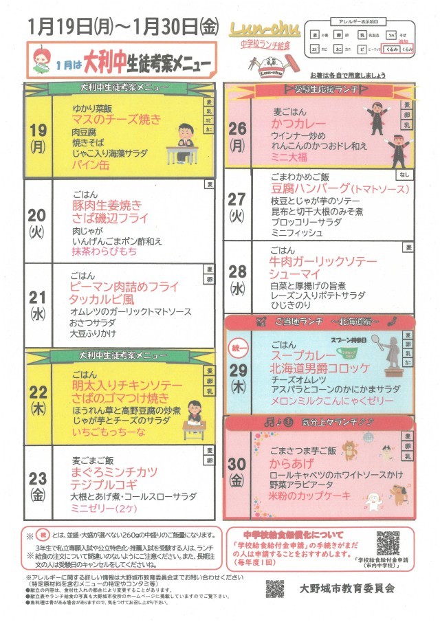 1月19日(月)、22日(木)は、大利中生徒考案メニュー