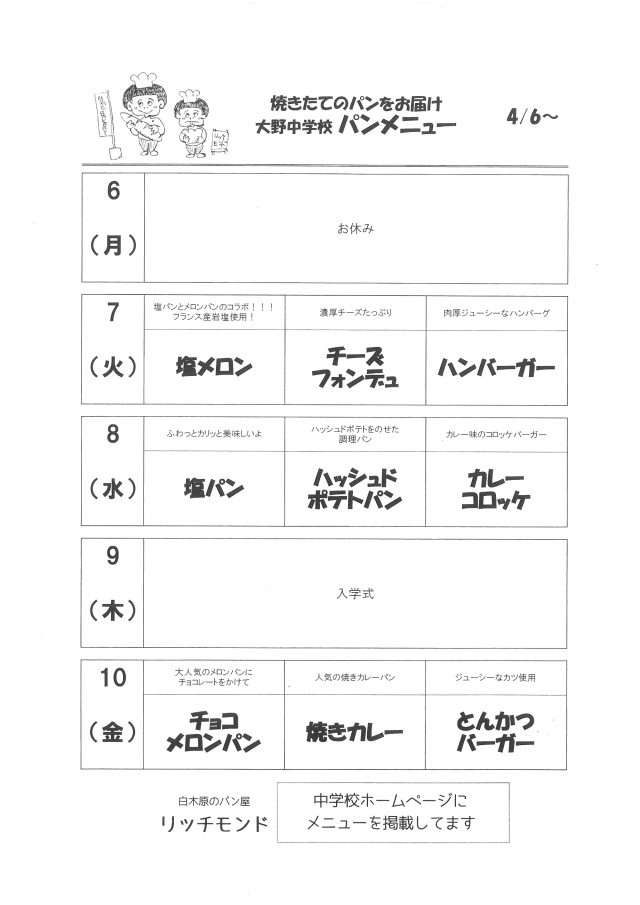 令和8年4月7日(火)~4月10日(金)パンメニュー