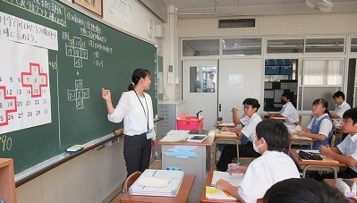 渡邊先生は1年2組で数学科「文字と式」の授業を行い、カレンダーにひそむ色々な法則を見つけ、文字式を使って考え、説明する内容でした。ヒントカードやグループ交流を通して、自分なりの考えを持ち、法則を見つけ出すことができていました。「今日の授業はたのしかった」という言葉が印象的でした。