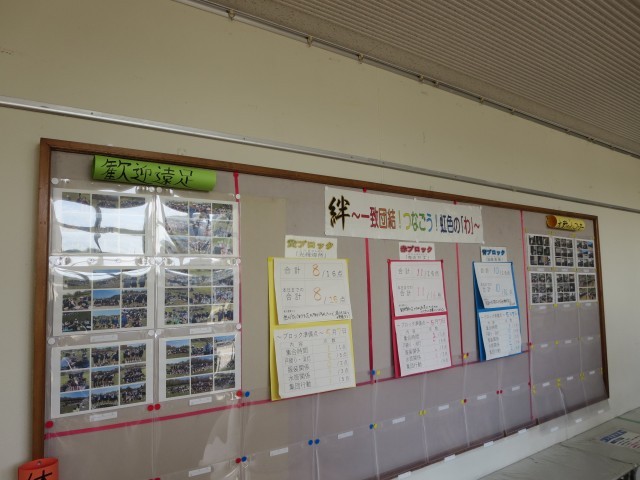 生徒会役員のみんさんが、昇降口に設置してある生徒会掲示板に行事の写真や体育祭練習におけるプロセス点の結果を掲示してくれています。