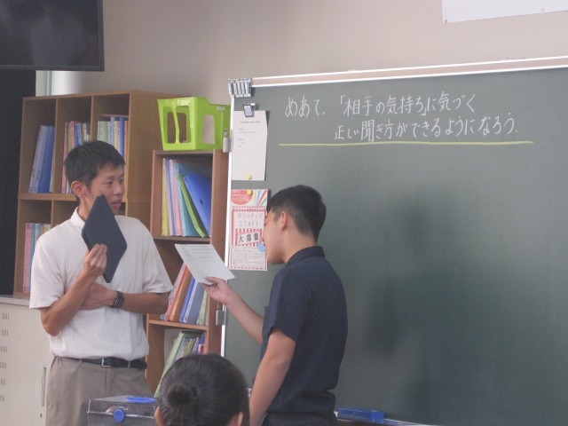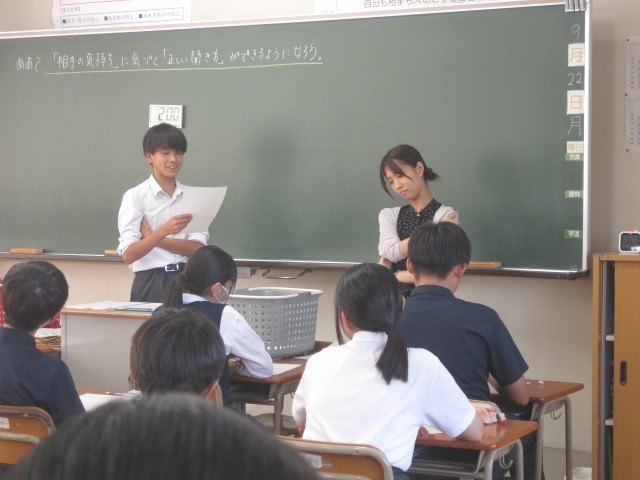 定期テストⅡが終わり、午後は授業が行われました。2年2組、2年4組では「SEL-8S」に取り組み、「相手の気持ち」に気づく聞き方ができるようになりました。導入部分で先生たちの2種類の聞き方を見て、どうだったかを話し合いました。先生たちの俳優並みの演技に脱帽です!