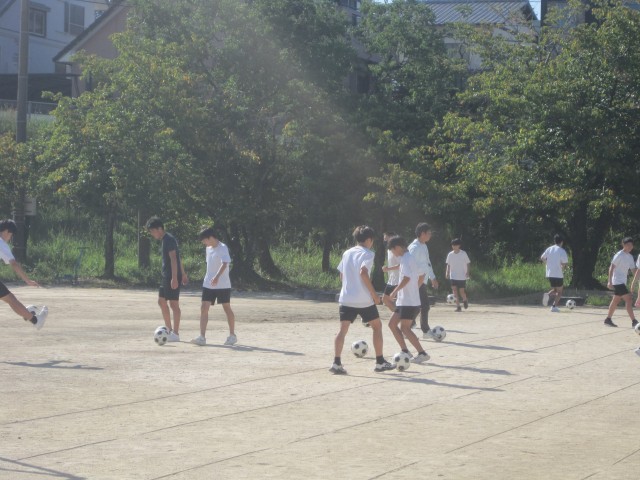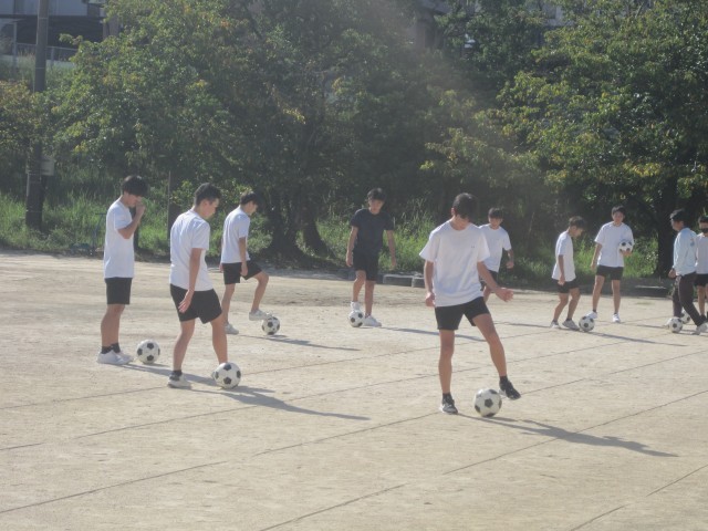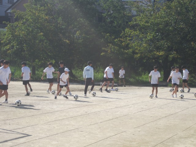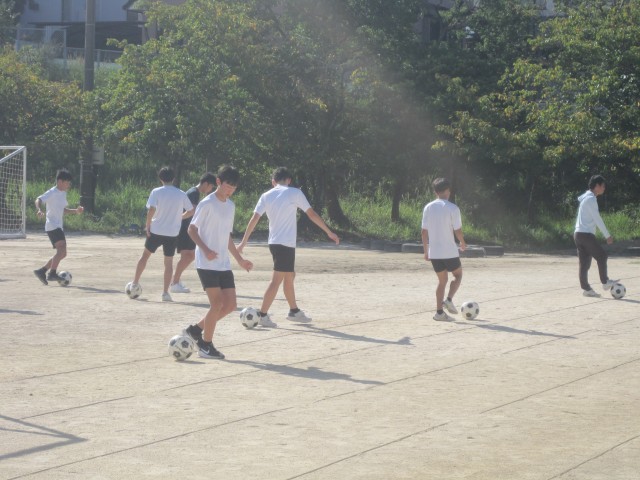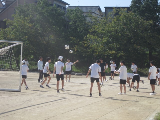 10月1日(水)、3年7組の男子は保健体育の授業でサッカーをしていました。「ボールが弾まないように、体全体を使って…」と坂本先生がアドバイスします。先生のお手本を見ながら、練習する生徒の皆さん。上手になったかな?
