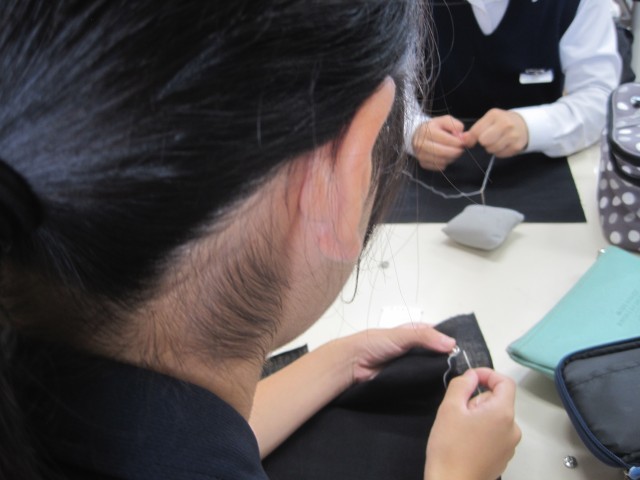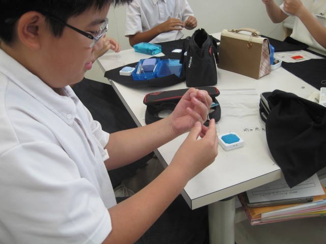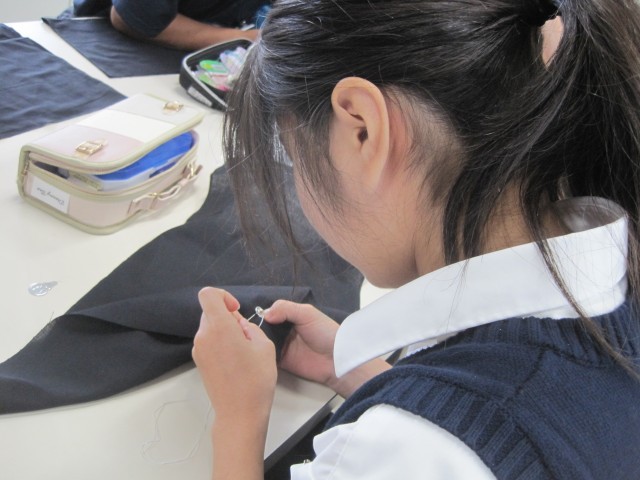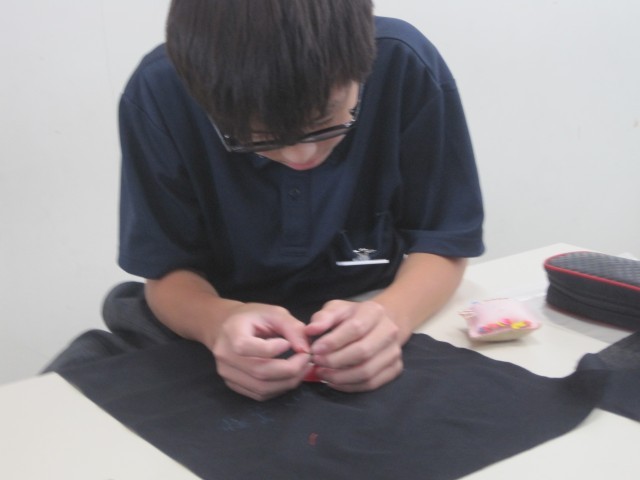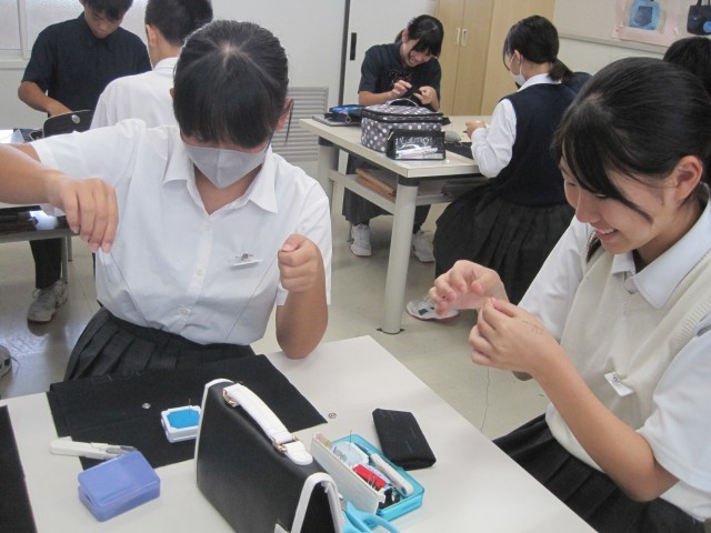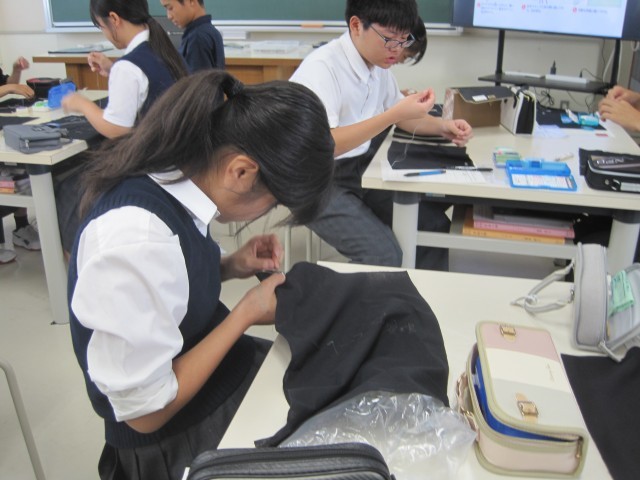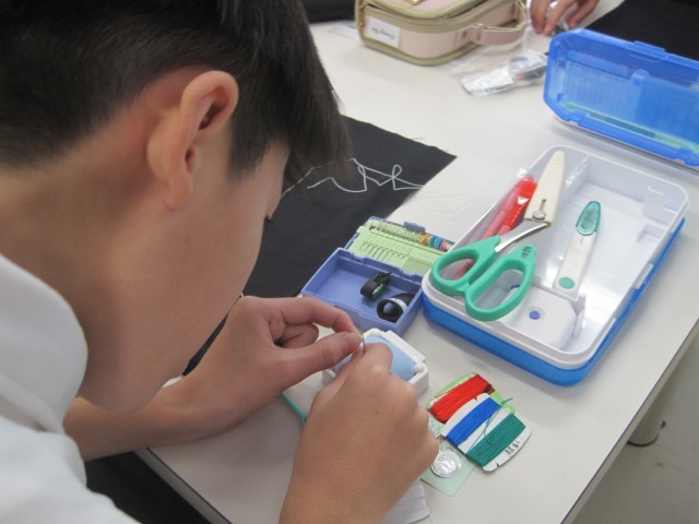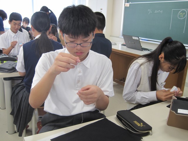 1年1組の家庭科の授業では、ホックをフェルトに付けました。針に糸を通す段階で苦戦し、玉結びに苦戦する生徒さんが多かったです。(そうですよね…普段、自分では…)糸を通すときに「これ使ったら簡単!」と便利な糸通しを班員に見せてくれた優しい人がいました!しかし、答えは「めんどう!」自力で通していました!