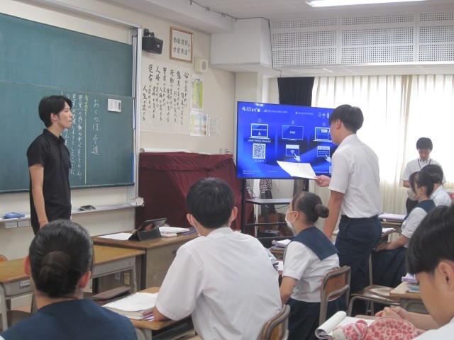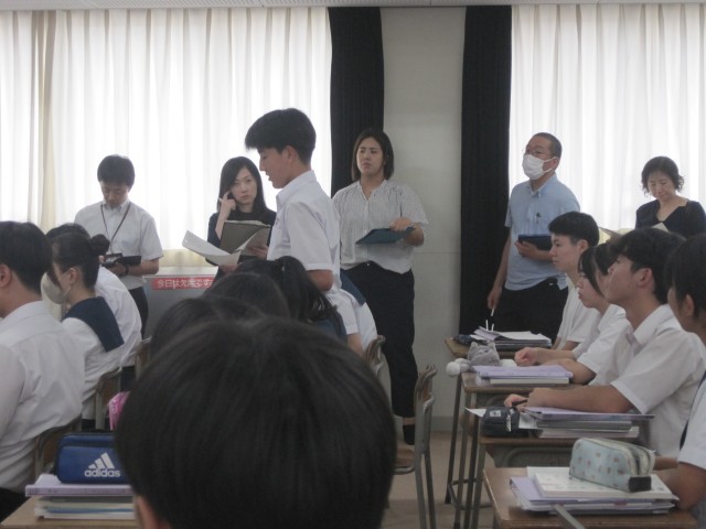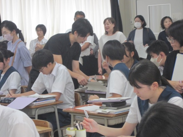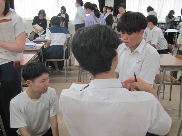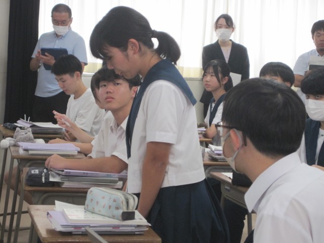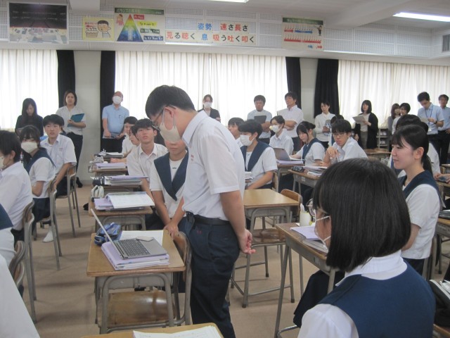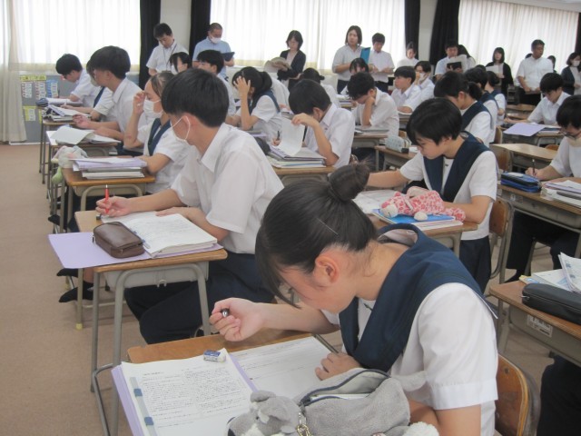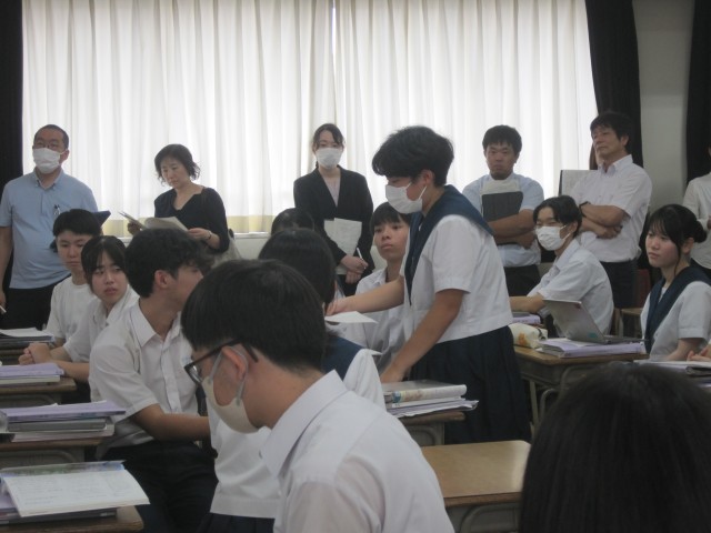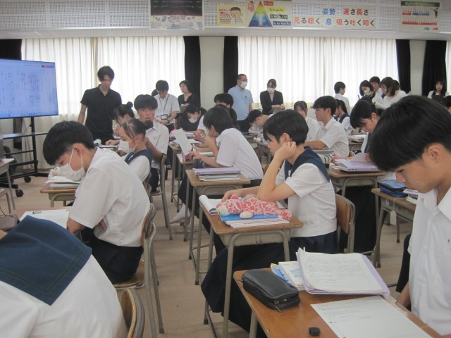 今週は、筑紫地区中学校国語科研究会の授業研究会が本校で行われ、木村先生が3年1組の授業を多目的室で行いました。たくさんの先生たちに囲まれ、少し緊張気味かな?と思いきや自分たちの考えを活発に交流することができました。「さすが~」と態度面で感心、発言の内容も「さすが!」と感心する1時間でした。