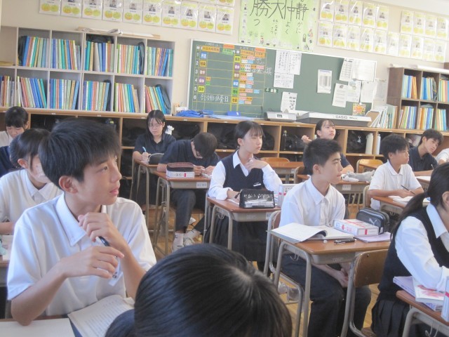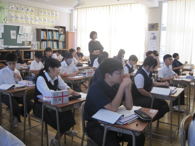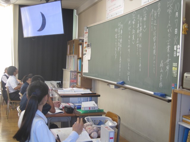 1年2組の国語の授業では、「比喩の世界」を学習していました。テレビ画面に映った絵を言葉で表現するなら、やはり比喩を使わないとうまく伝わりません。