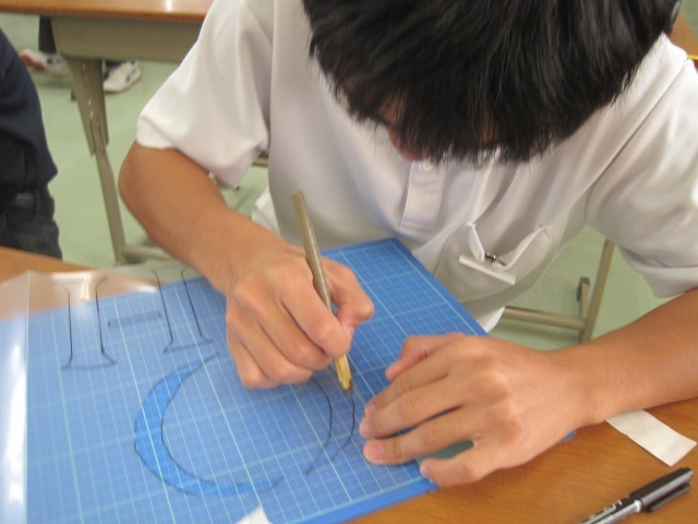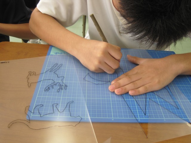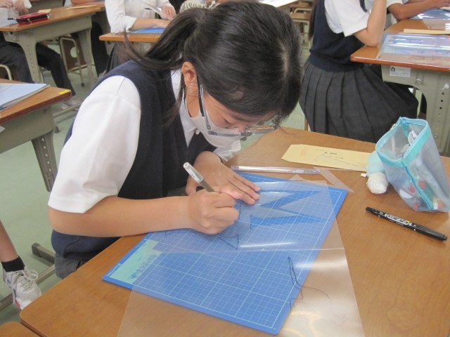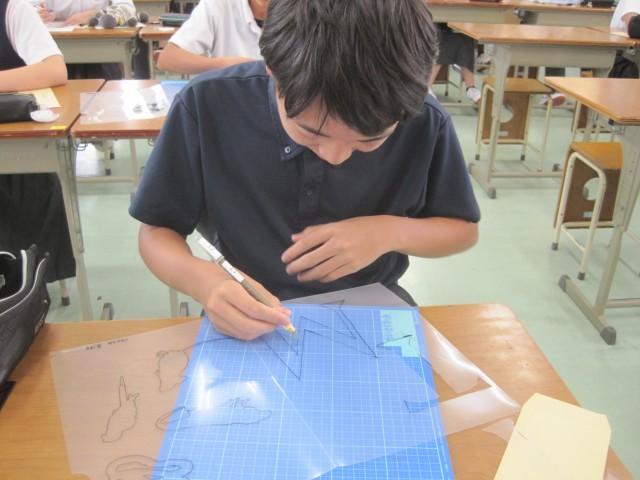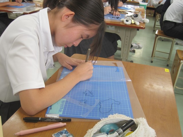 10月8日(水)、2年4組の美術の授業では、「自分のイニシャルを使って、オリジナルタペストリーをつくろう」と、イニシャル、動物を切り取り中でした。生徒の皆さんの目はとても真剣です!!