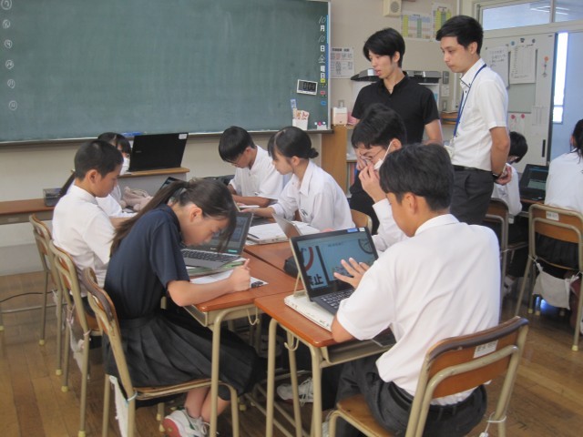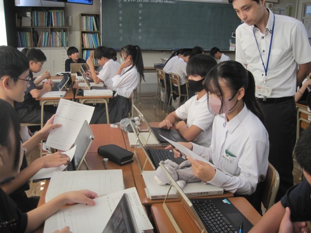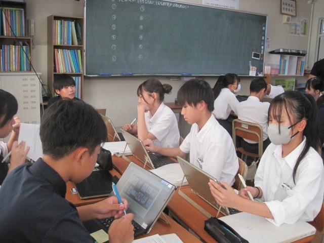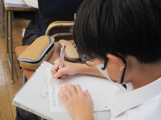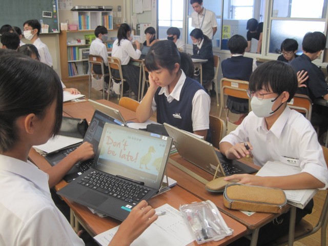10月10日(金)、1年5組では英語の授業で池上先生の授業公開が行われました。英文で書かれた啓発ポスターには、命令文が使われていることに気づきました。これから英文で啓発ポスターを作成します!