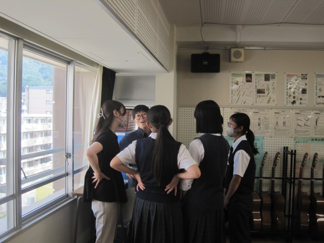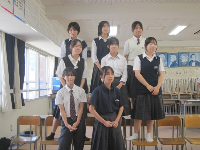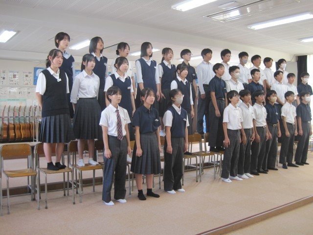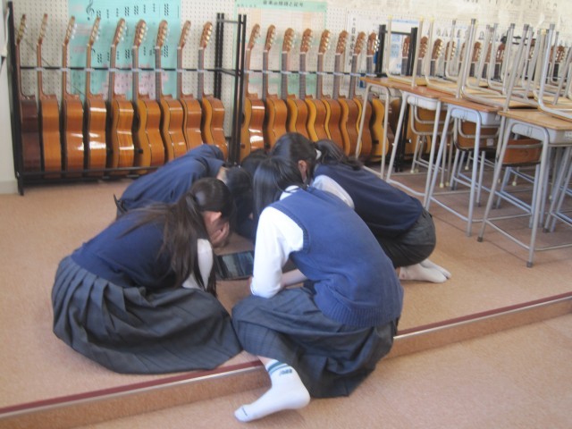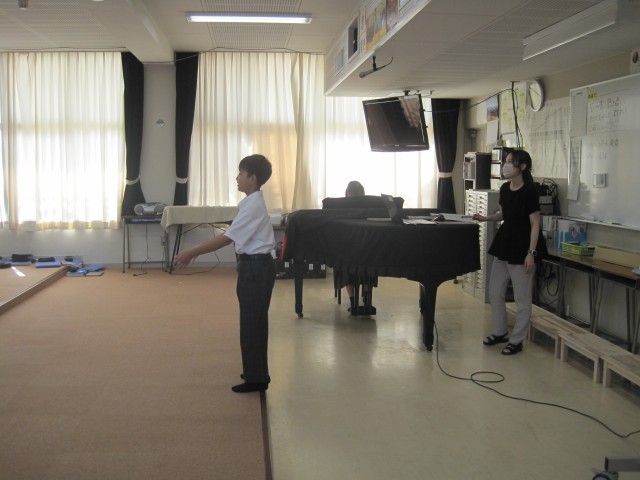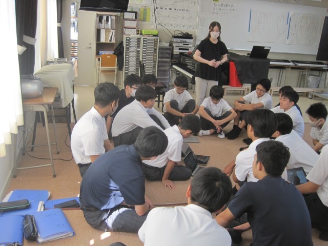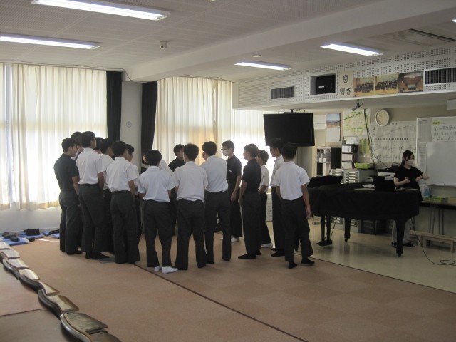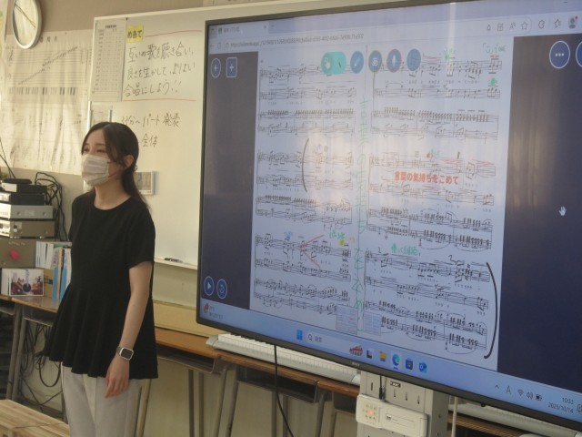 2校時に田中先生の授業研修が音楽室で行われました。2年4組の授業でした。パートのグループごとに歌声を録音し、どのような良さがあったのかを共有し、それを生かして練習に励みました。