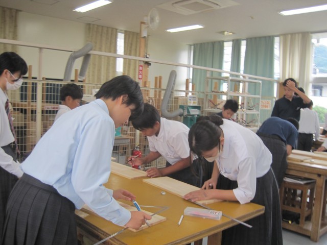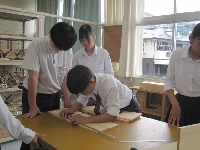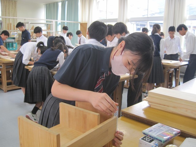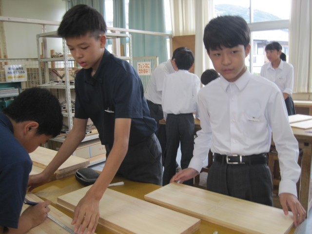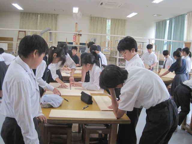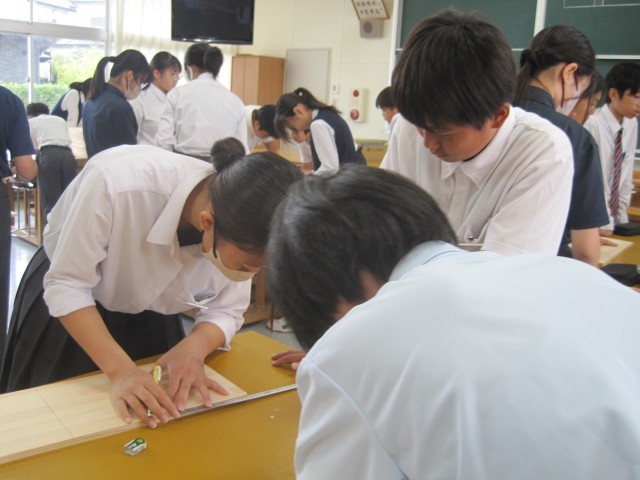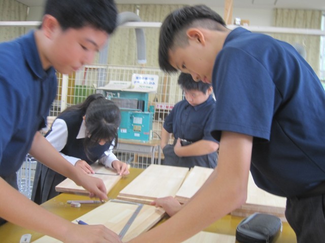 1年1組の技術の授業では、板の長さを班員で協力しながら測っていました。中には、先輩の作品でしょうか。完成した作品の長さを測っている人も!1mmの誤差なく測っているようです!