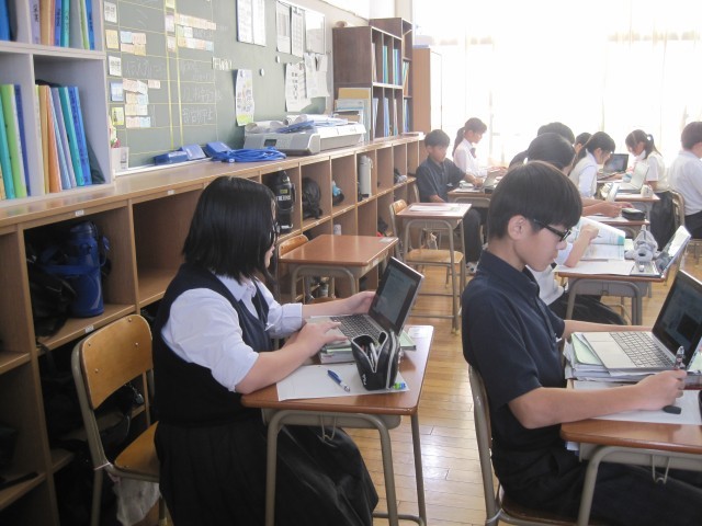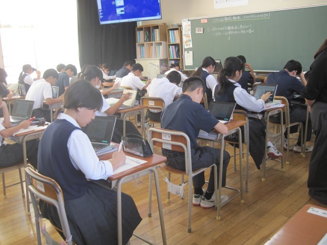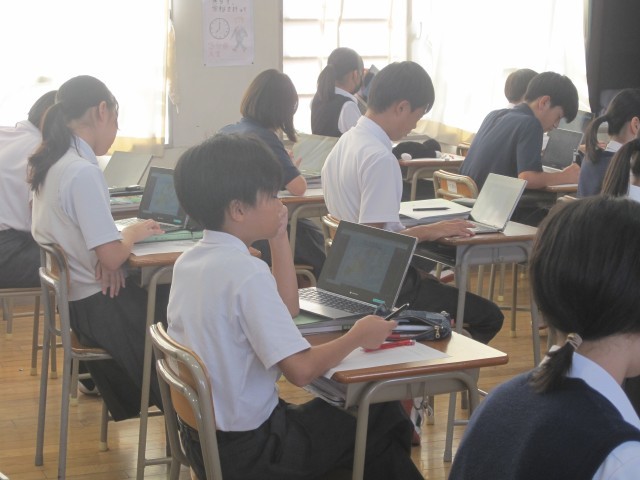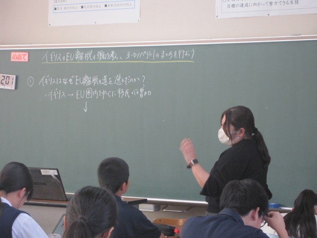 1年2組の社会の授業では、イギリスのEU離脱を考え、ヨーロッパ州のまとめをしました。タブレット上で配付された資料をもとに、自分の考えをまとめました。