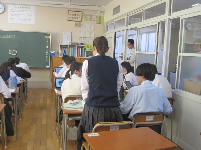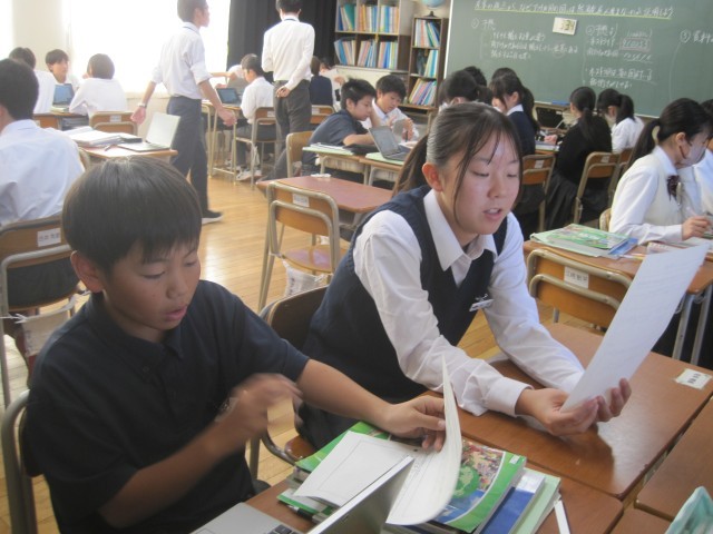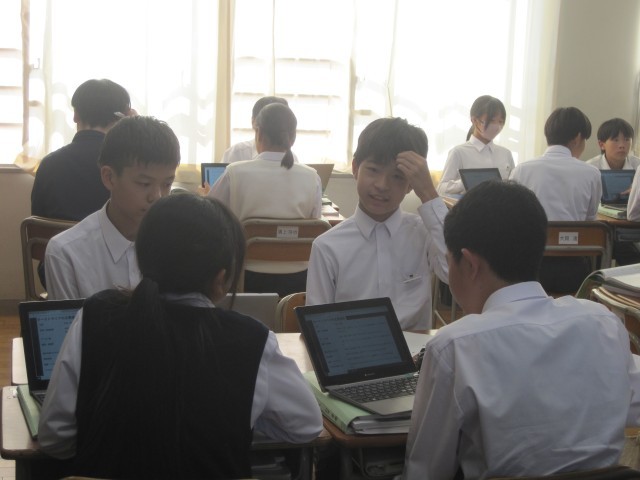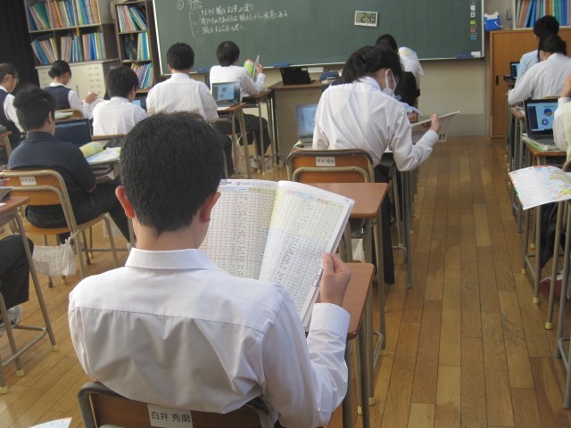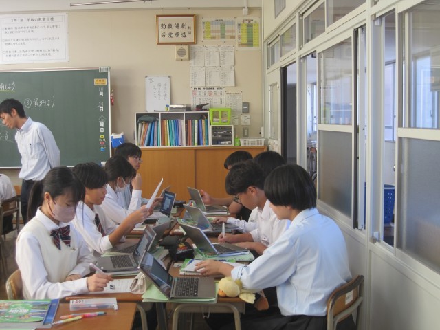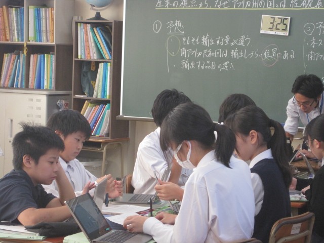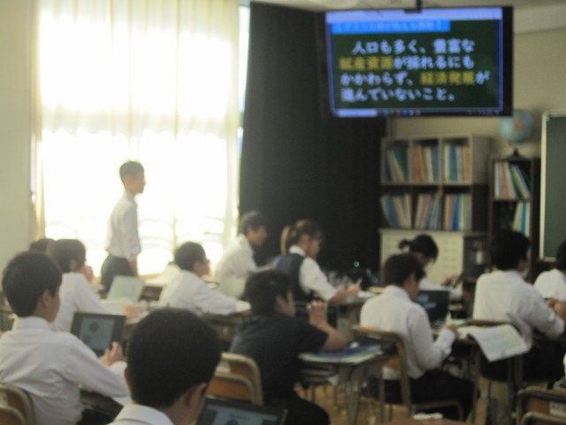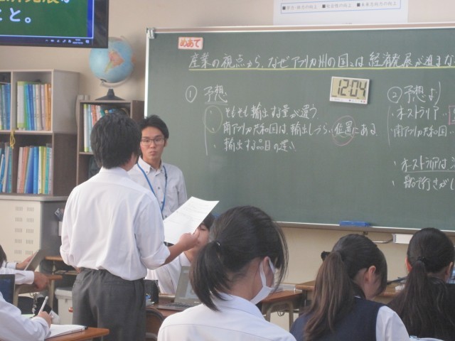 授業研修の一環として、1年1組で岡山先生の社会の授業が行われました。オーストラリアとアフリカ州の産業構造を比較しました。「鉱産物!」「GDP!」「APEC!」など、生徒たちはポンポンと難しい答えを発言し、参観した先生たちを驚かせます。先生たちも学びの場になりました!