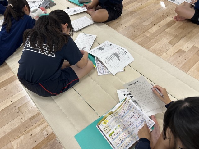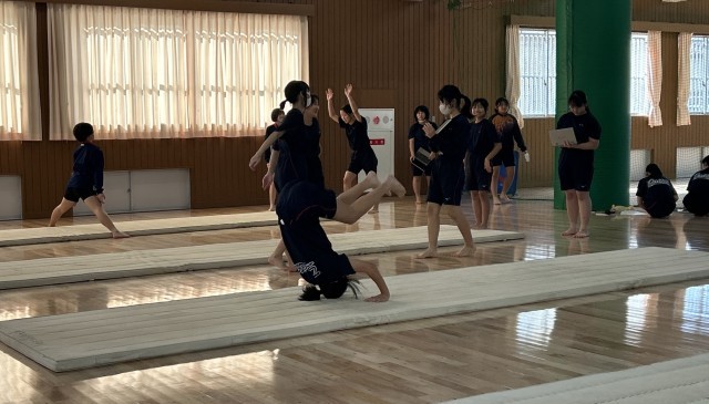 これまでの授業で習得したマット運動の技を3つ組み合わせて発表する練習を行いました。