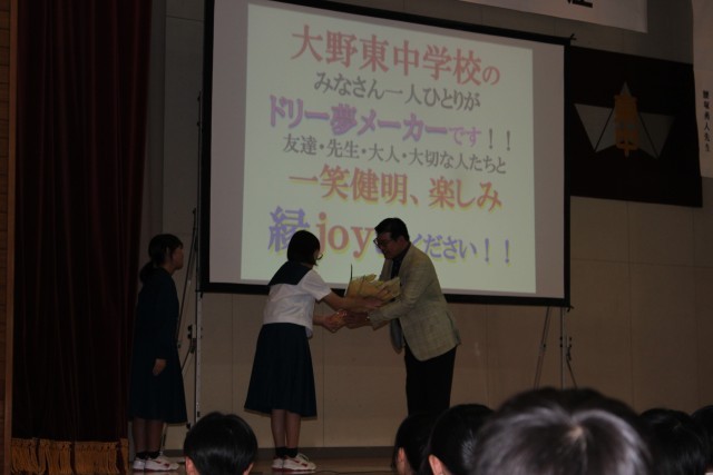 校長室に戻られるとき、腰塚先生は私に、「大野東中の子どもたちは本当に素晴らしいですね!聞く態度も立派で、かわいくて、いきいきとした目をしている。これからもっともっと伸びますね!」と褒めてくださいました。