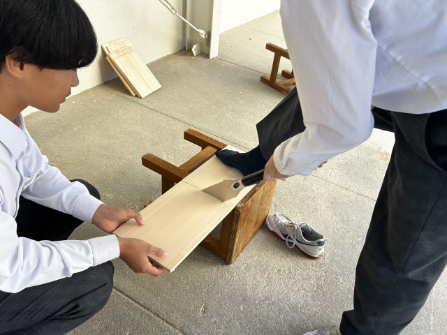 1時間目に技術室では、1年3組の木工の授業が行われていました。