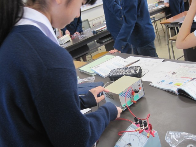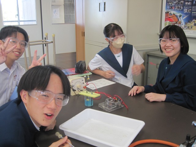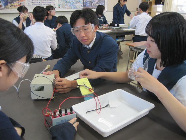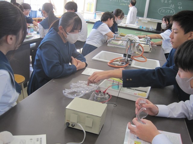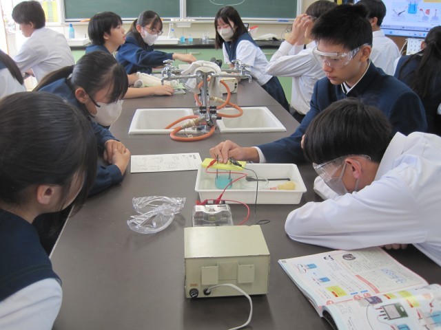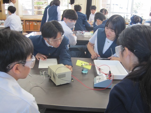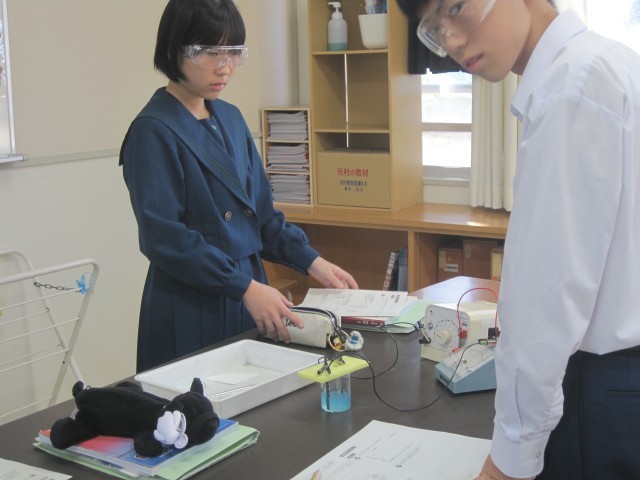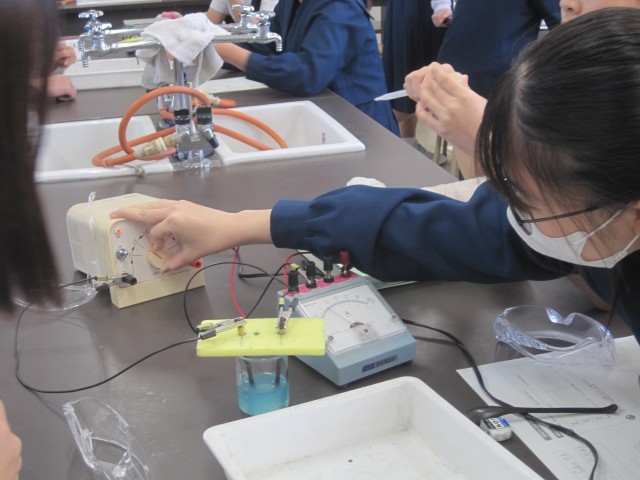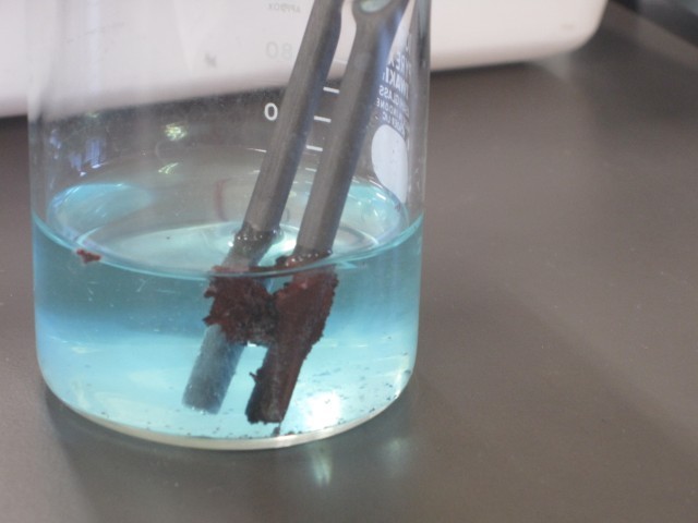 3年2組の理科の授業では、塩化銅水溶液に電流(500mA)を流すと、水溶液の中で何が起こるか実験しました。何が起こるかワクワクして見ていると、きれいなコバルトブルーの水溶液に…。最後の写真のようになりました!