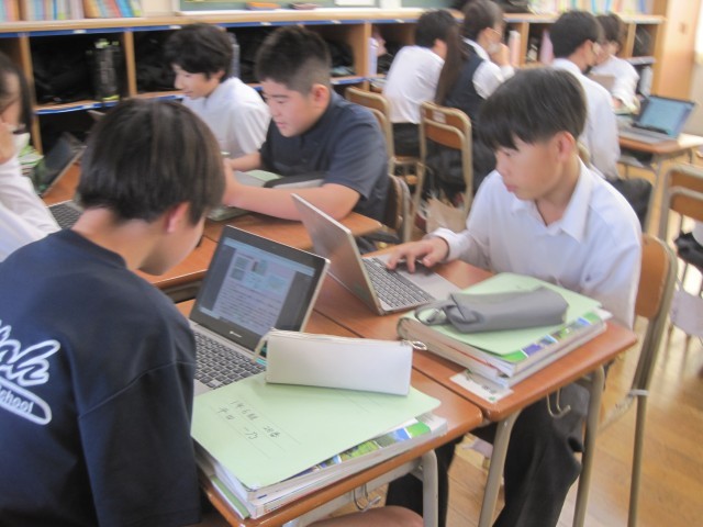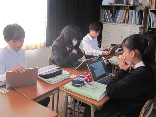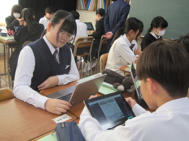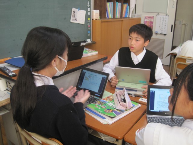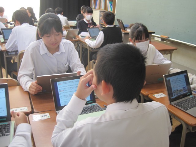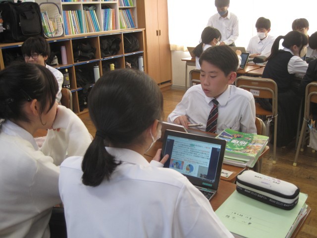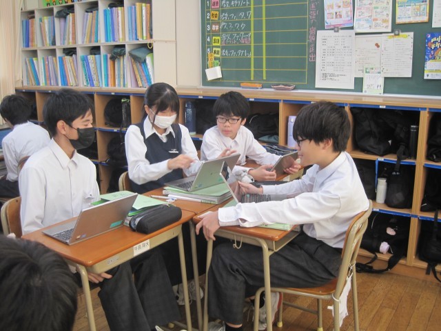 1年6組の社会の授業では、北アメリカの農業チーム、工業チームに分かれ、それぞれ調べたものを発表し、質問し合いました。「五大湖って何?」と質問したり、発表後拍手をしたり、積極的に活動しました。