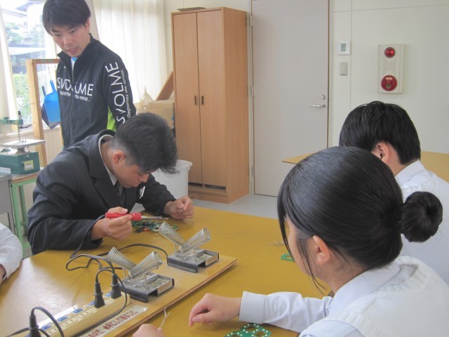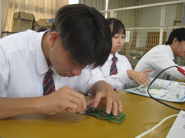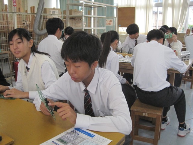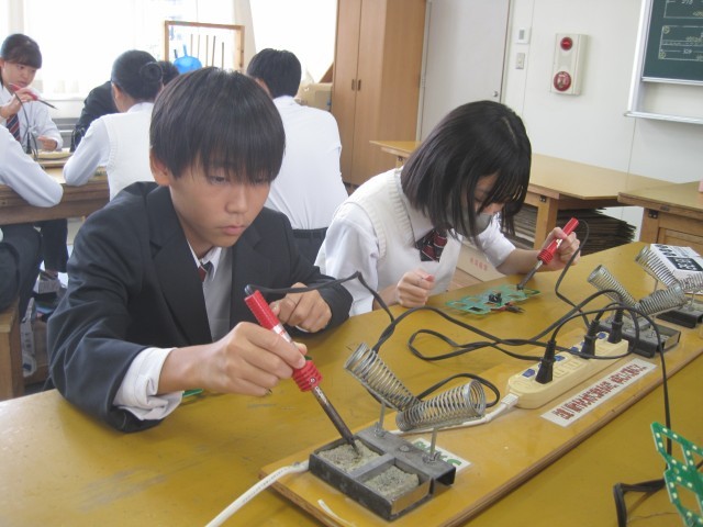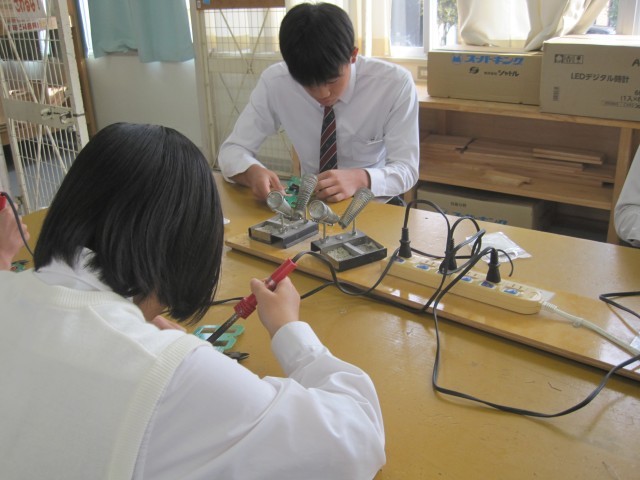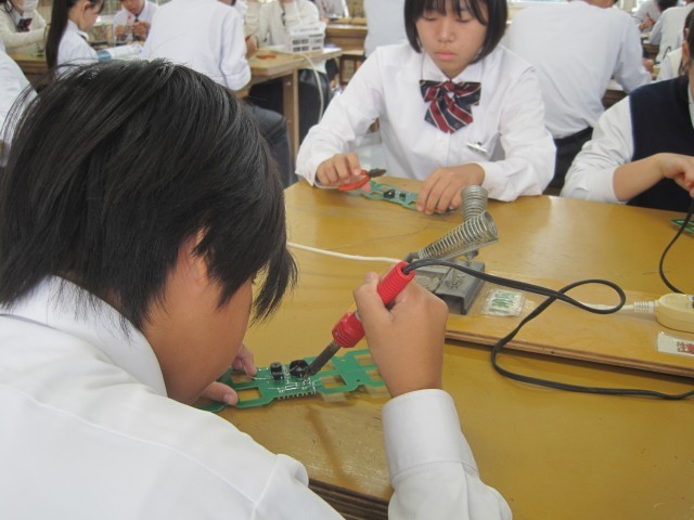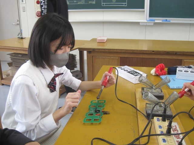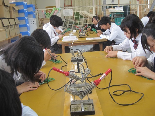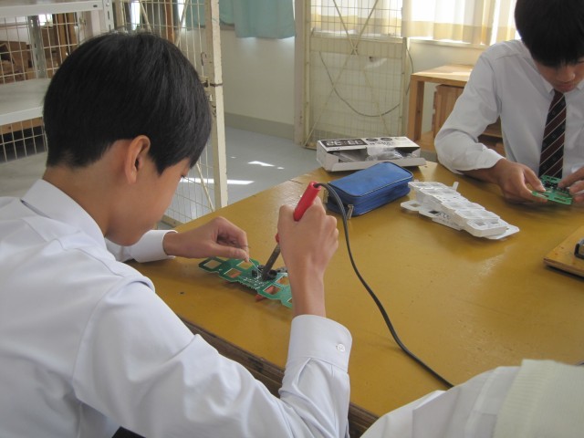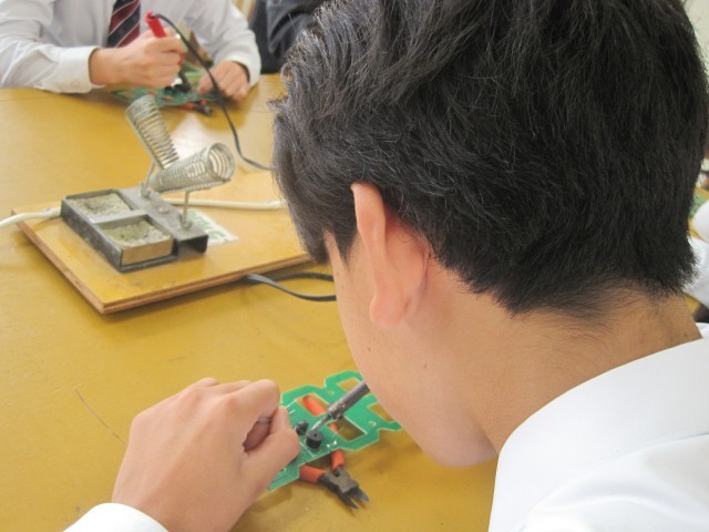 2年1組の技術の授業ではLEDデジタル時計を作成していました。はんだ付けに集中、その後ニッパーで切るという超集中ぶりです!「楽しそう!」と羨ましがると、「はい!楽しいです!」と返事が返ってきました。
