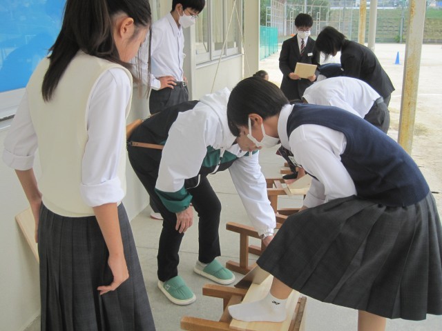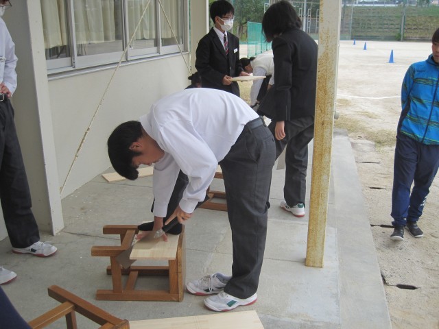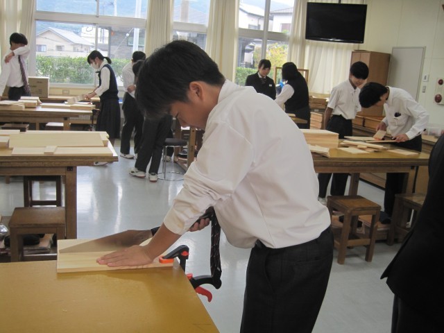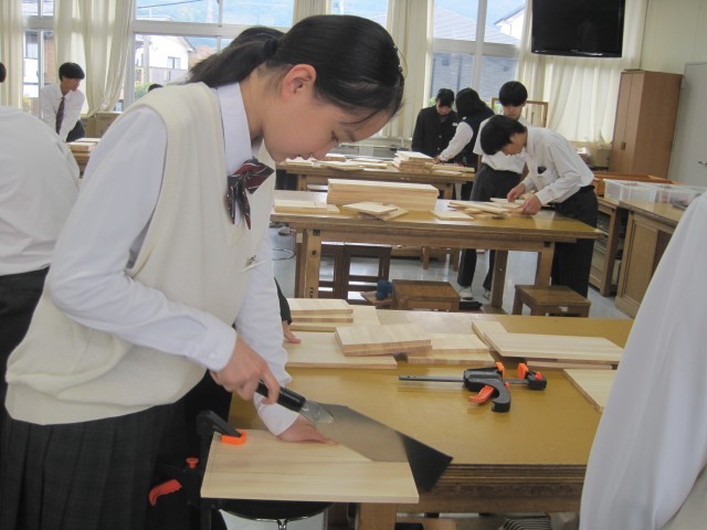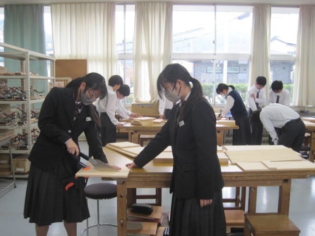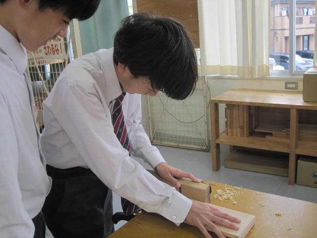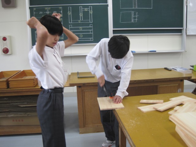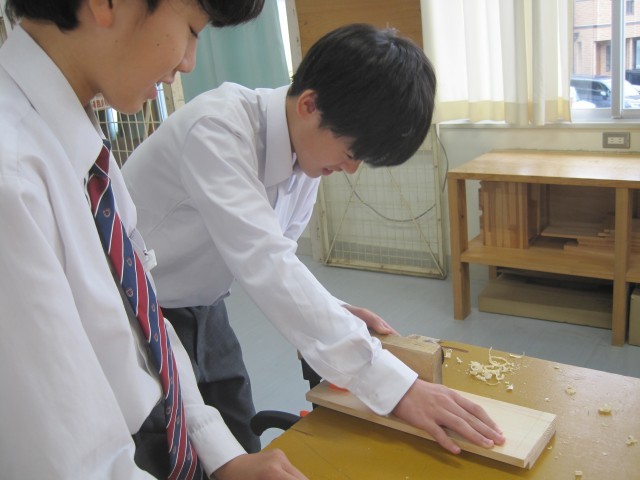 1年3組の技術の授業で、まっすぐに切ろうと真剣です。「先生~、」と斜めになってしまった生徒さんが訴えました。「山内先生に聞いてみようか」と言うと、「いや、ここを…」と自分で修正案を出せました。自分で解決策を考えようとする姿がさすがです!