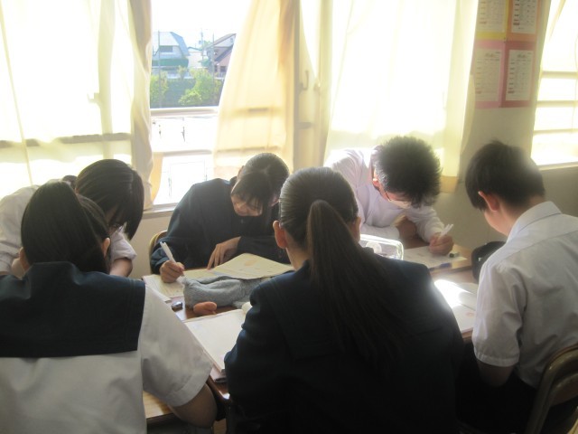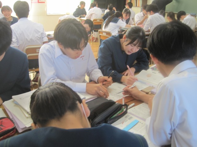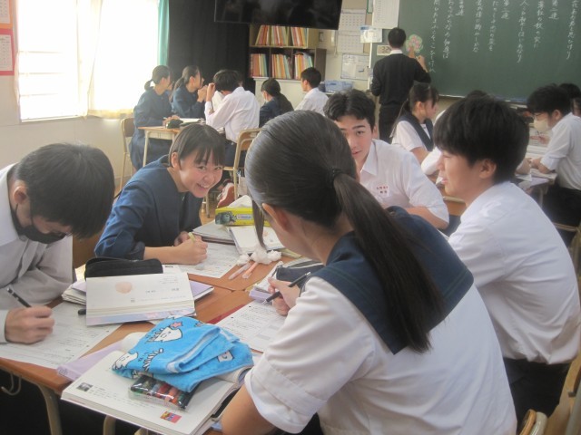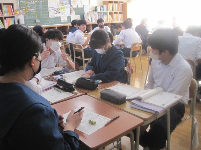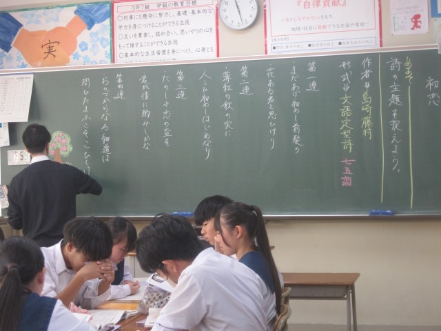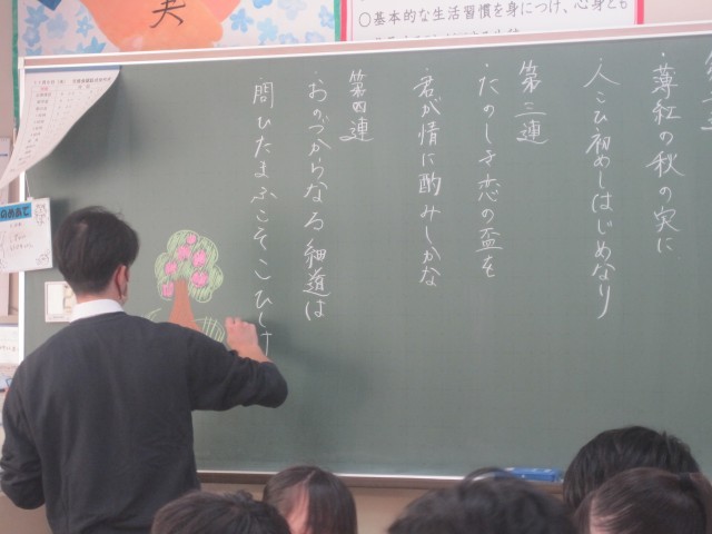11月6日(木)、3年7組の国語の授業では、島崎藤村の「初恋」を班で読み味わっていました。班を見まわていると、木村先生の様子に「!」リンゴの木の絵がとても上手ですね‼!