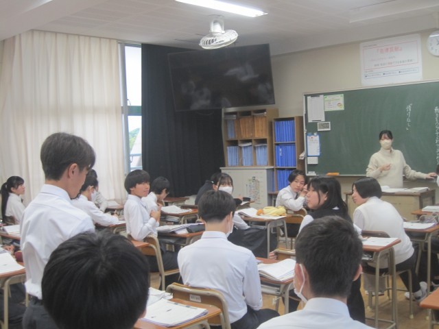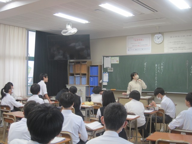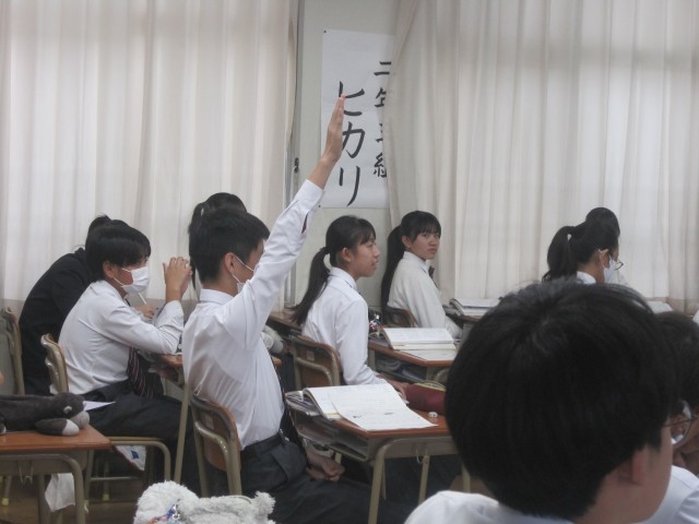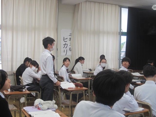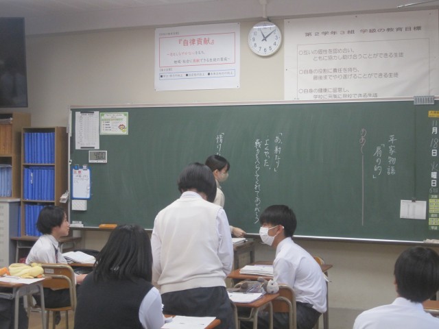 2年3組の国語の授業では、『平家物語』の那須与一が自分をの偉業を賞賛した平家の武士を射殺し、「あ、射たり」「情けなし」と言われた場面を読みました。なぜそのように言ったのか、自分の考えを述べました。