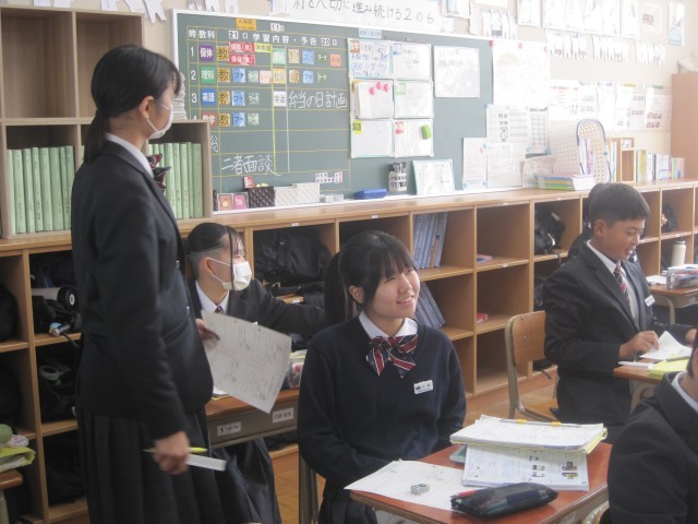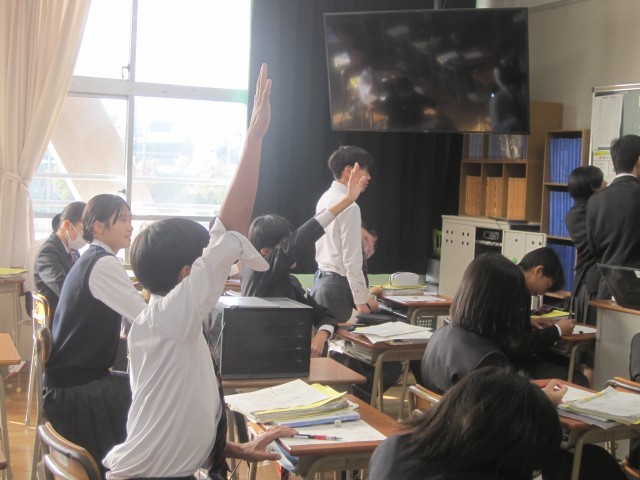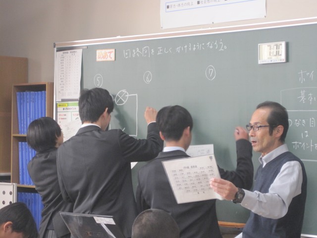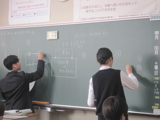 2年6組の理科の授業では回路図をかく練習を行いました。発表の際は手を挙げる生徒が多く、意欲的です!先生から「正しく、美しく!」と回路図のクオリティを求められました。