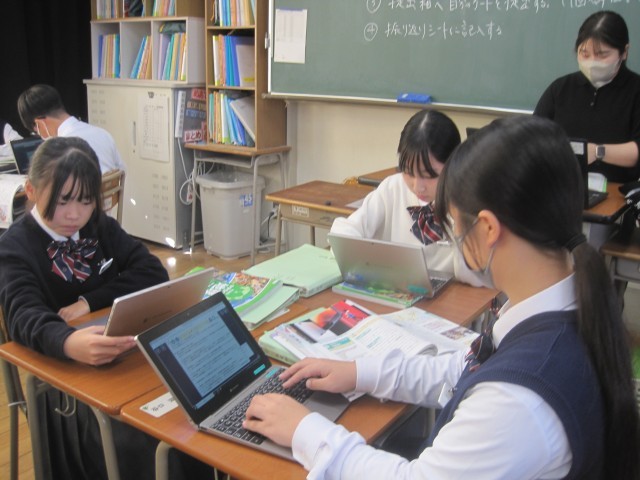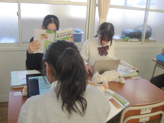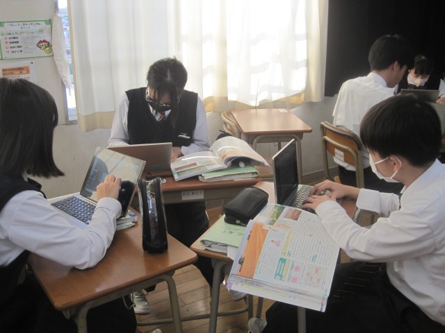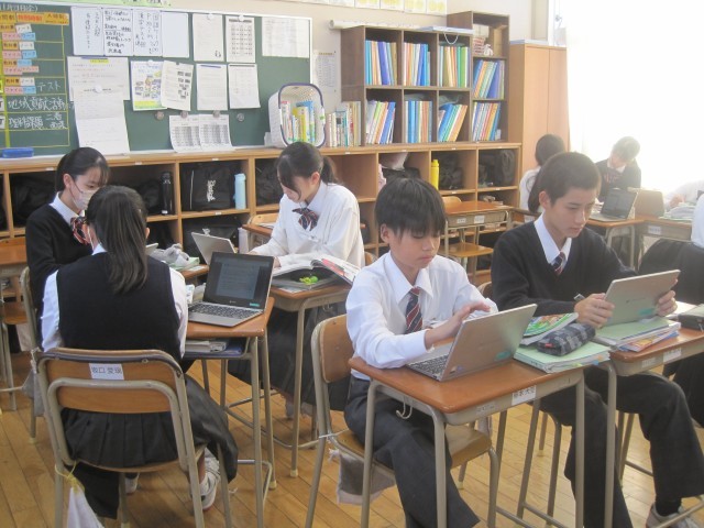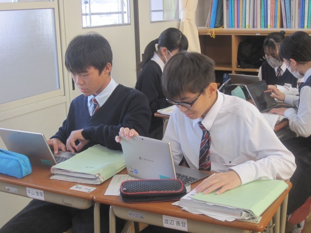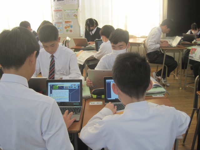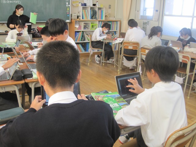 1年2組の社会の授業では、単元の課題「なぜアメリカ合衆国は、超大国と呼ばれているのか」を追究しました。誰一人一言も発することなく黙々と活動が進んでいました。担当の藤先生に尋ねると、「あと10分ぐらいで提出なんです!」それを聞いた生徒の皆さんのどよめきが…「あと10分?」活動に拍車がかかりました。
