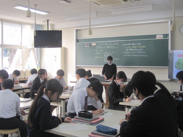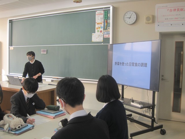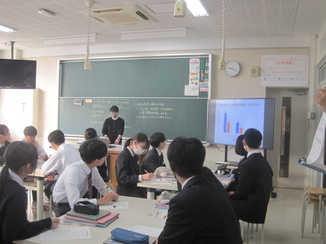 11月25日(火)の1校時、2年4組の家庭科の授業は、寺田先生の授業研修でした。旬の野菜であるほうれん草の栄養を、無駄なくとるための調理方法について学習しました。生野菜とゆで野菜ではかさが異なり、たくさん食べられる、一日の野菜の摂取量がどのくらいかなど学習しました。