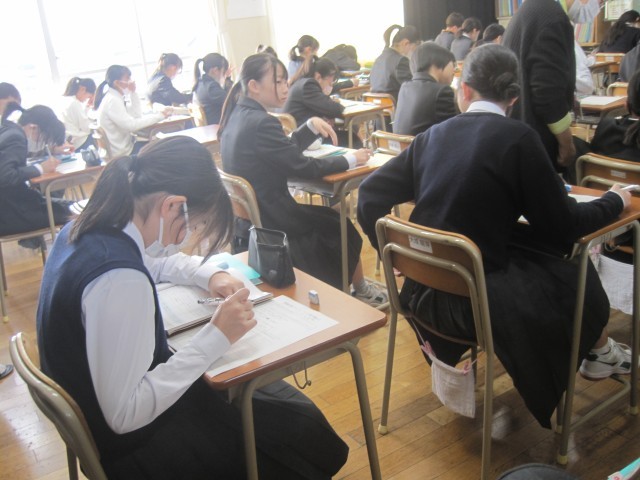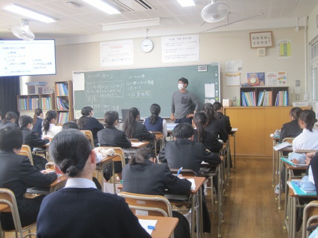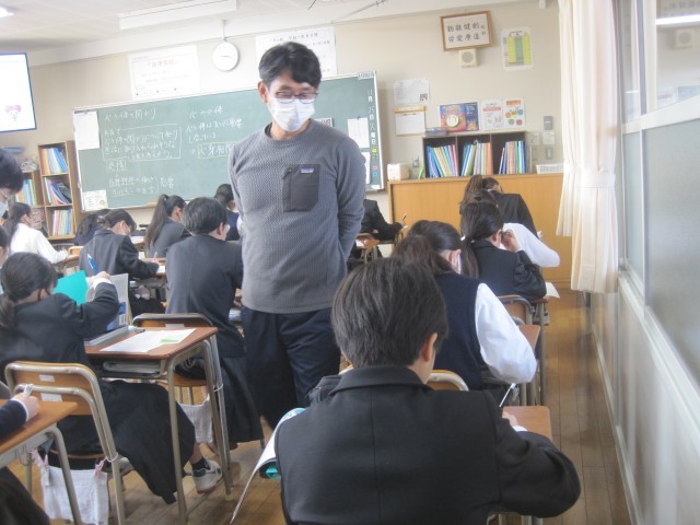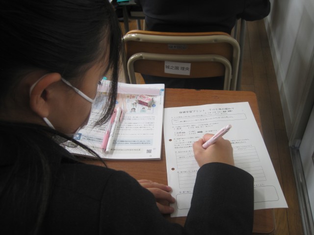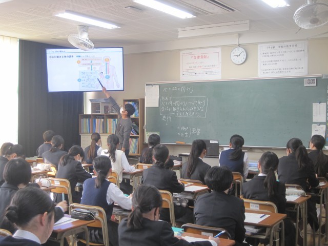 1年5,6組の保健体育女子の授業は、坂本先生の授業研修でした。心と体の関わりについて考えました。不安が続くとき、体がどのようになっているかと先生から問われ、「眠りが浅くなる」「痩せる」など、次々に発言することができました。