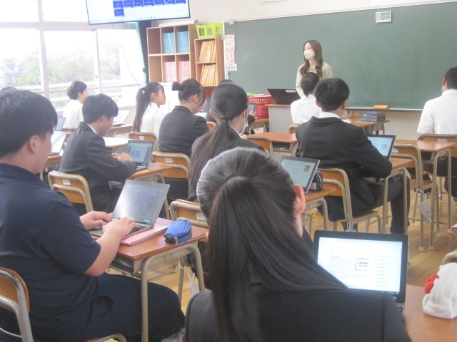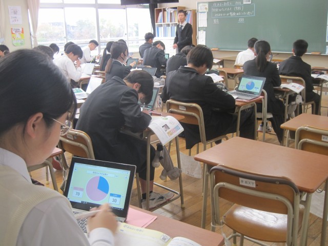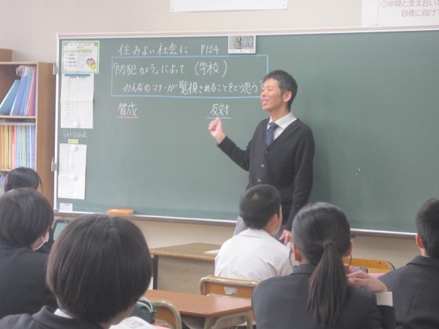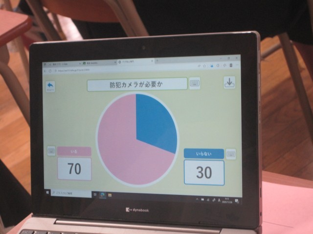 2年生の道徳では、学校に防犯カメラが必要か必要でないかを考えることを通し、住みよい社会について考えました。タブレットを用い、自分たちの考えを瞬時に共有し、自分事として考えることができました。