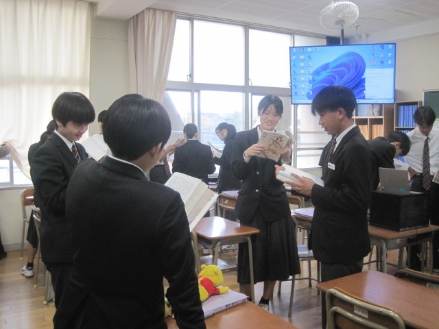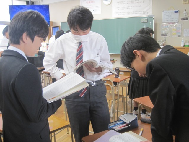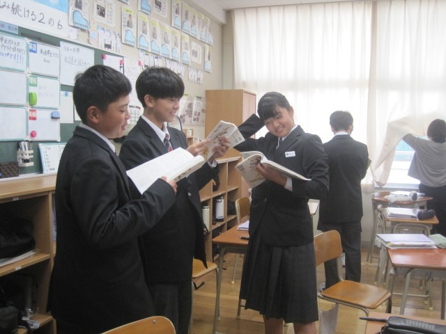 2年6組の国語の授業では、『平家物語』の那須与一が扇の的を射る場面を音読していました。句読点ごとに順番に読みました。途中、「えっ?」と私から言われ、「??」もう一度読み直しますが、再度、私の「えーっ??」読み方を教えました。生徒さんからは「覚えているんですか?」「そんなに有名なんですか」と驚きの声が!!一応、国語科です(^o^)/