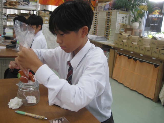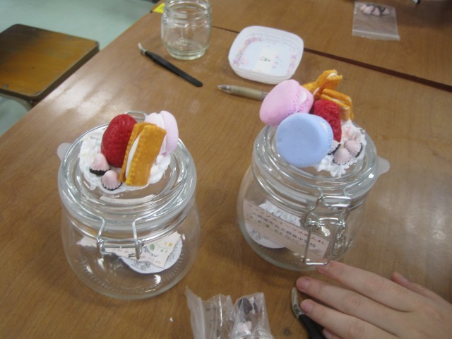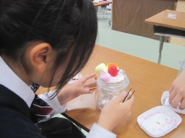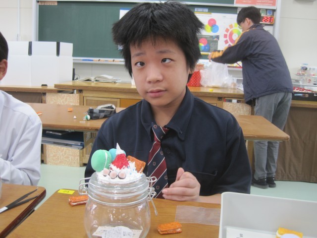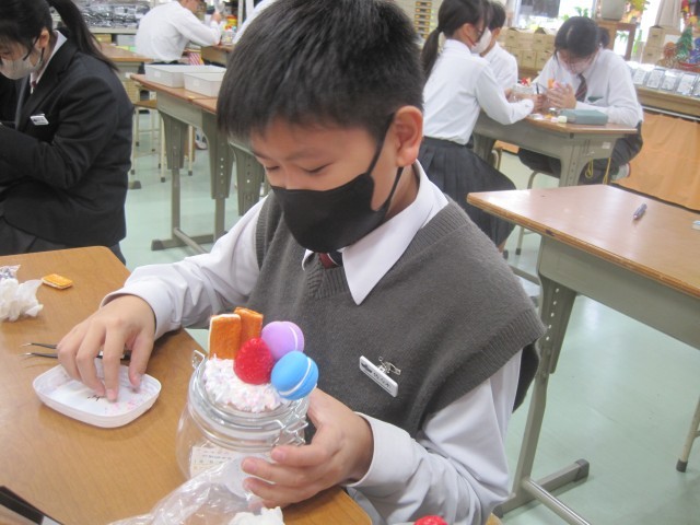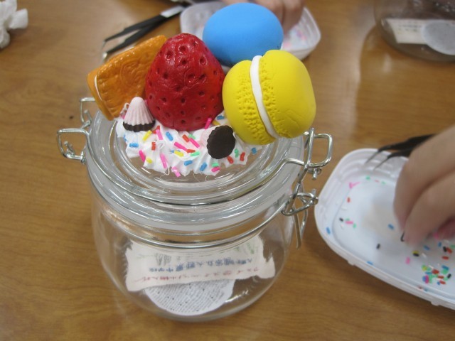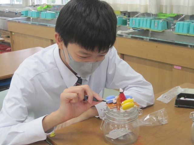 1年1組の美術の授業で取り組んでいたフェイクスイーツが、ほぼ完成しました!ミックスカラースプレーをピンセットで一つ一つ取り、飾り付けるなど、こだわりが見られます!
